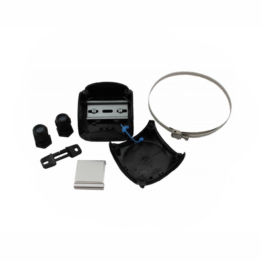 - Jednoduchá montážní plastová krabice v černé barvě pro ovládací moduly Casambi pro přichycení na různé stožáry, lampy nebo další válcové předměty.