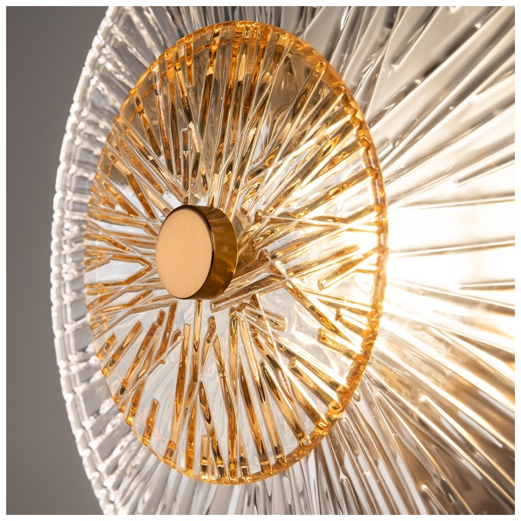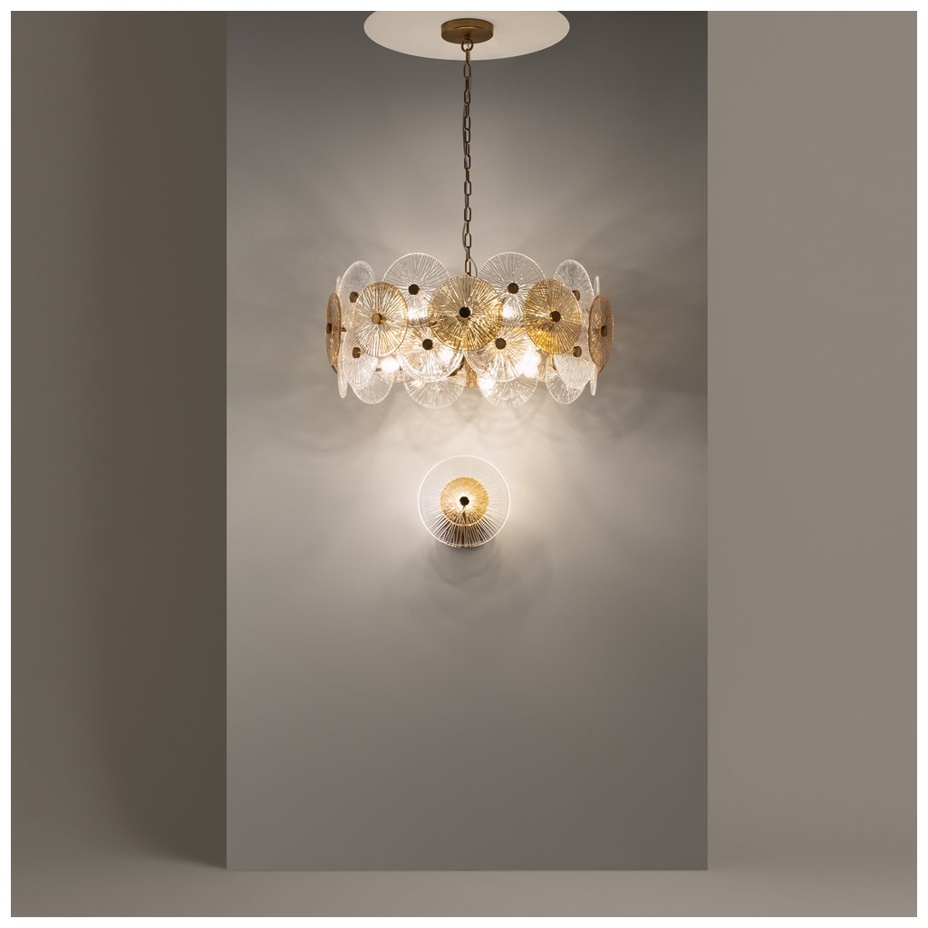 Elegantní nástěnné svítidlo Aster Wall ztělesňuje bohémského ducha obohaceného o prvky art deco. Jádrem designu luxusního svítidla Aster Wall jsou sférické komponenty vyrobené ze skla ve dvou barvách: čiré a jantarové. Texturovaný povrch stínidel odráží současné designové trendy, zatímco zlatý kovový rám podtrhuje nadčasovou sofistikovanost art deco.