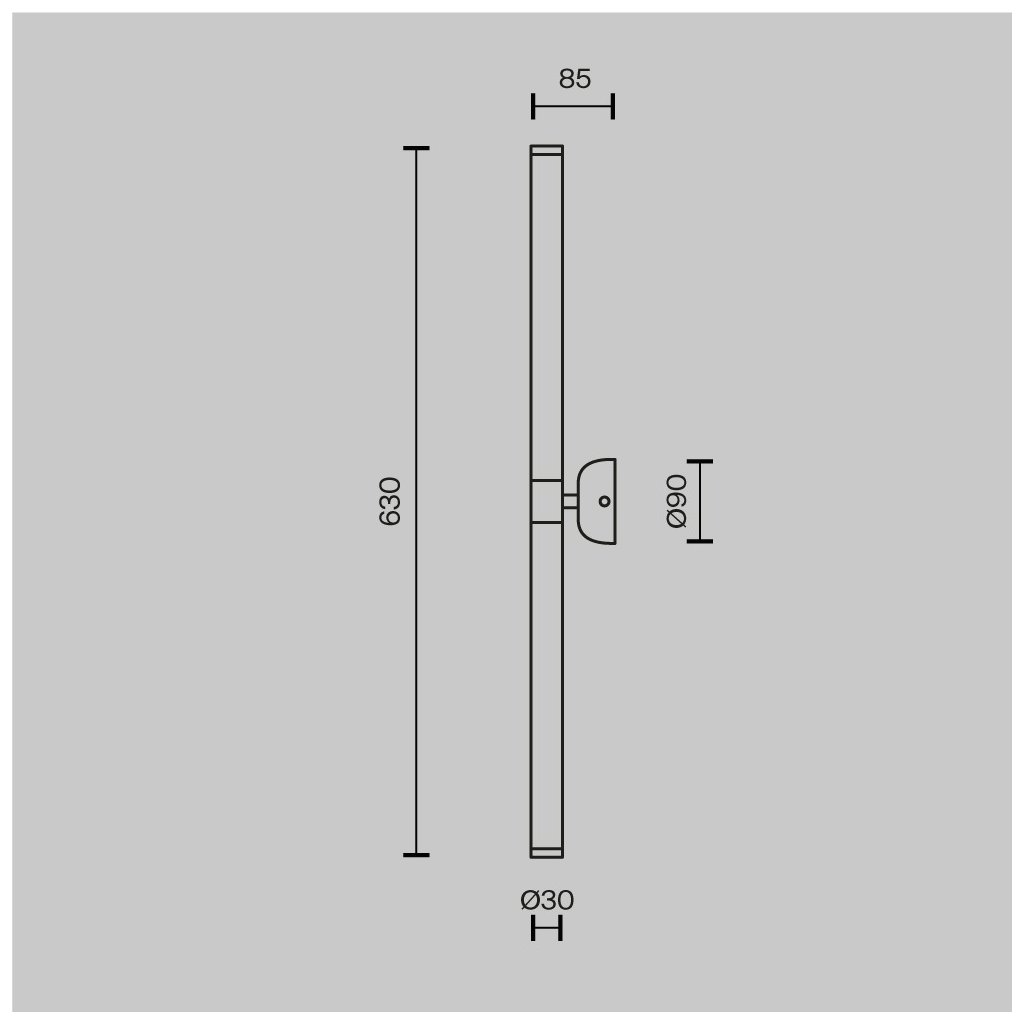 Rozměry svítidla jsou ø30/630 mm, šířka svítidla je 85 mm.