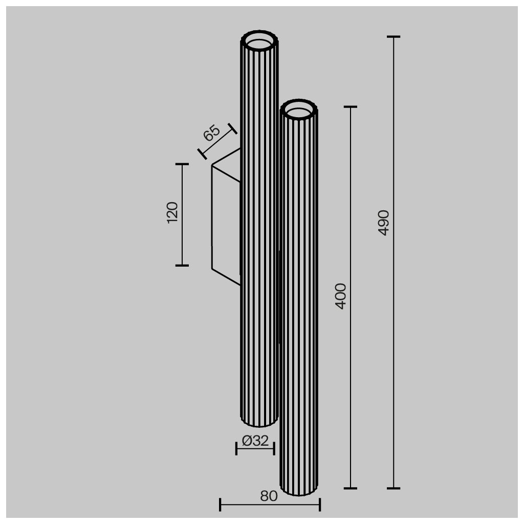 Rozměry každé trubice jsou ø32/400 mm a celkové rozměry svítidla jsou 80/65/490 mm. (d/š/v)