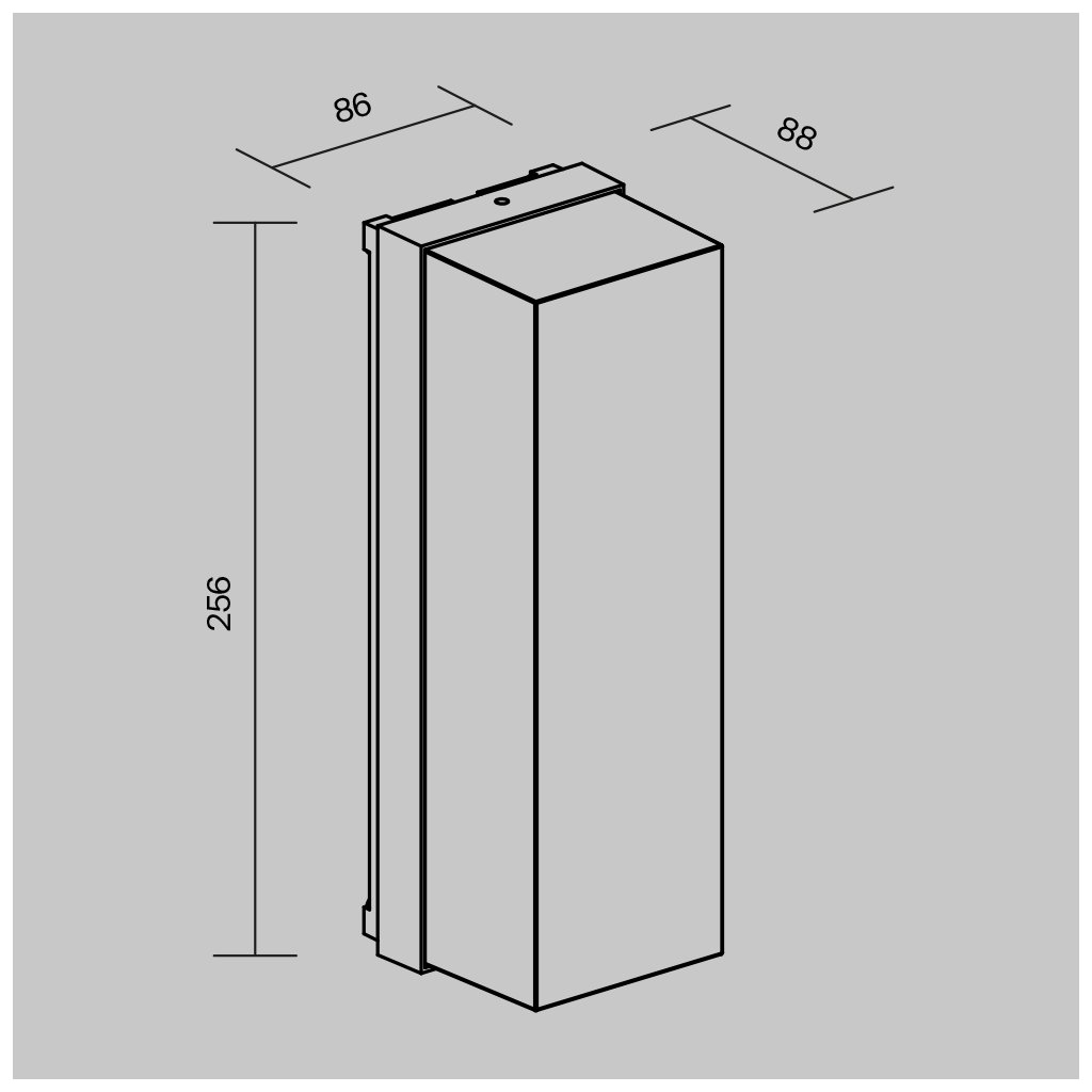 Rozměry svítidla jsou 88/86/256 mm. (d/š/v)