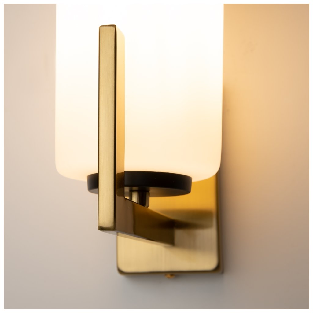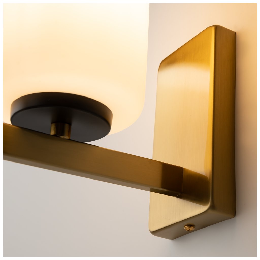 Krásné retro svítidlo Fortano Wall se vyznačuje elegantní kombinací přesných geometrických tvarů a nadčasových barevných schémat. Vizuální lehkost svítidla je dosažena díky kontrastu mezi mosazným rámem a válcovým bílým skleněným stínítkem, které vyzařuje měkké rozptýlené světlo. Tato nástěnná lampička se hojně používá pro osvětlení kuchyní, ložnic, obývacích pokojů, hotelů, lobby, restaurací, hal, kanceláří, vstupních prostorů, šatníků a chodeb.