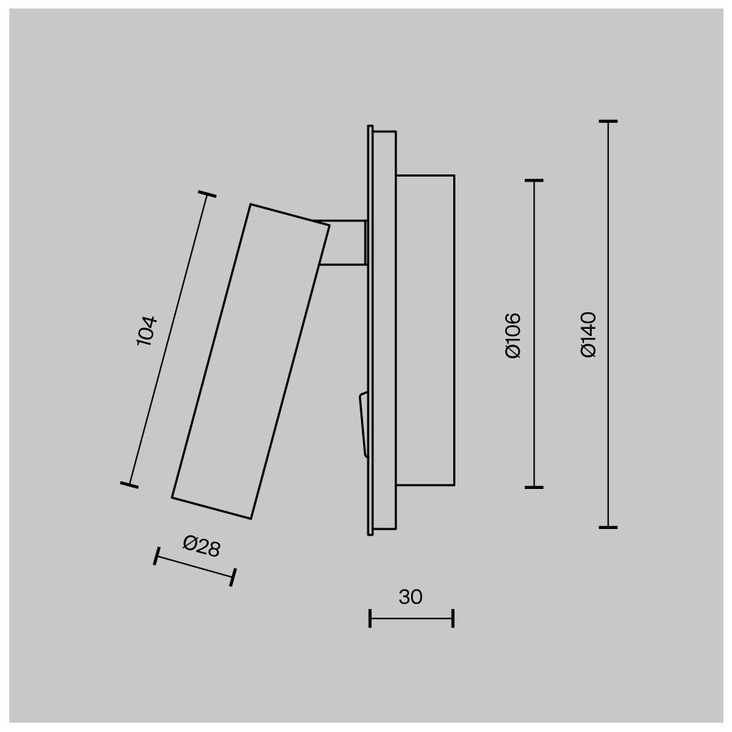 Rozměry hlavy svítidla jsou ø28/104 mm a rozměry základny jsou ø140/30 mm.