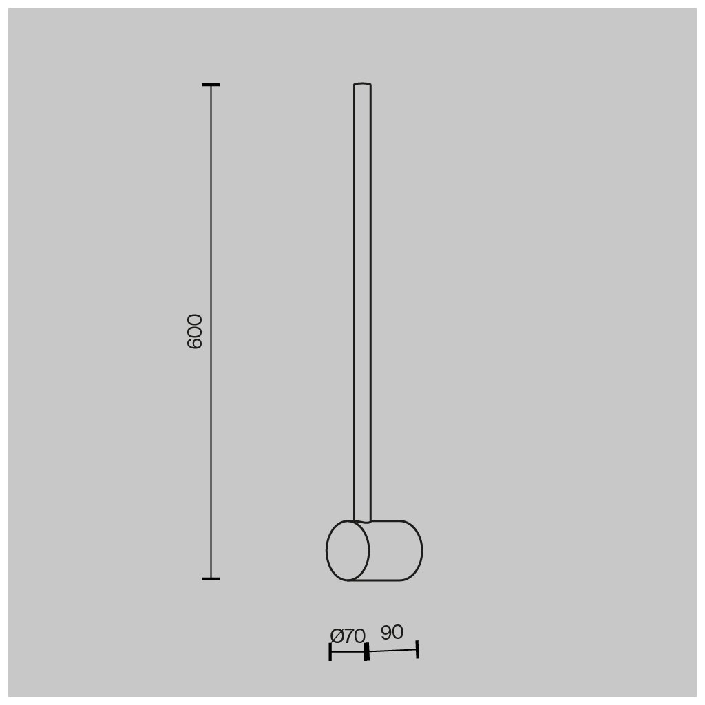 Rozměry svítidla jsou ø70/600 mm a délka svítidla je 90 mm.