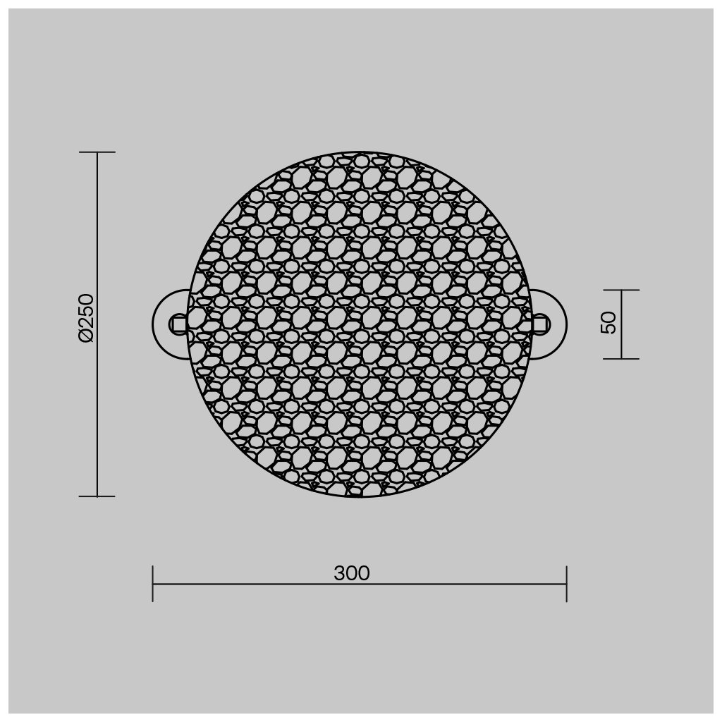 Rozměry stínítka jsou ø250/20 mm a celkové rozměry svítidla jsou 110/300/250 mm. (d/š/v)
