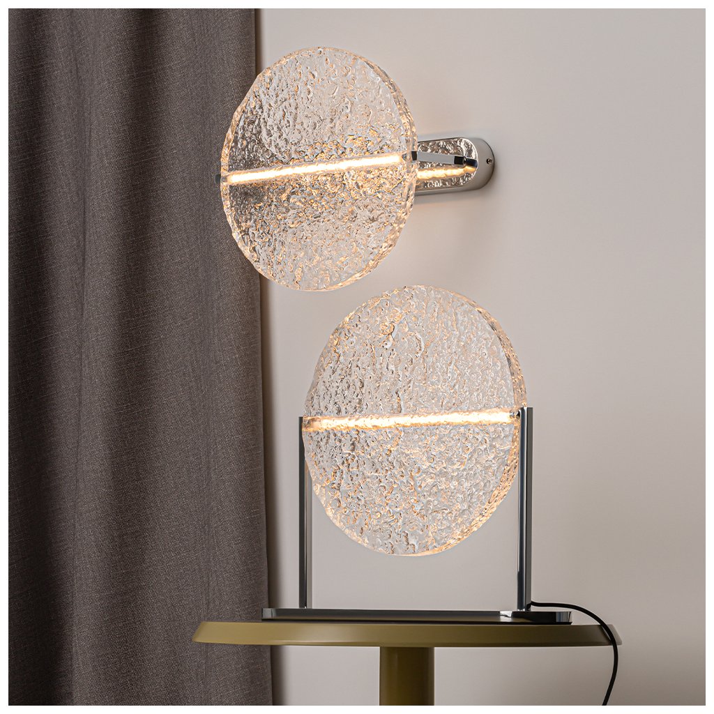 Slovo mångata ve švédštině znamená „odraz měsíčního svitu na vodě“. Nástěnné svítidlo čerpající inspiraci z tohoto slova samo zachycuje poetickou krásu měsíčního svitu a zvlněné vodní hladiny. Kulaté skleněné stínítko se odráží od zrcadlové základny a vytváří zajímavou iluzi hloubky a nekonečna. Texturovaný skleněný difuzér navíc vrhá měkké, rozptýlené světlo, jako by sám měsíc sestoupil z oblohy, aby naplnil prostor klidem a vyrovnaností.