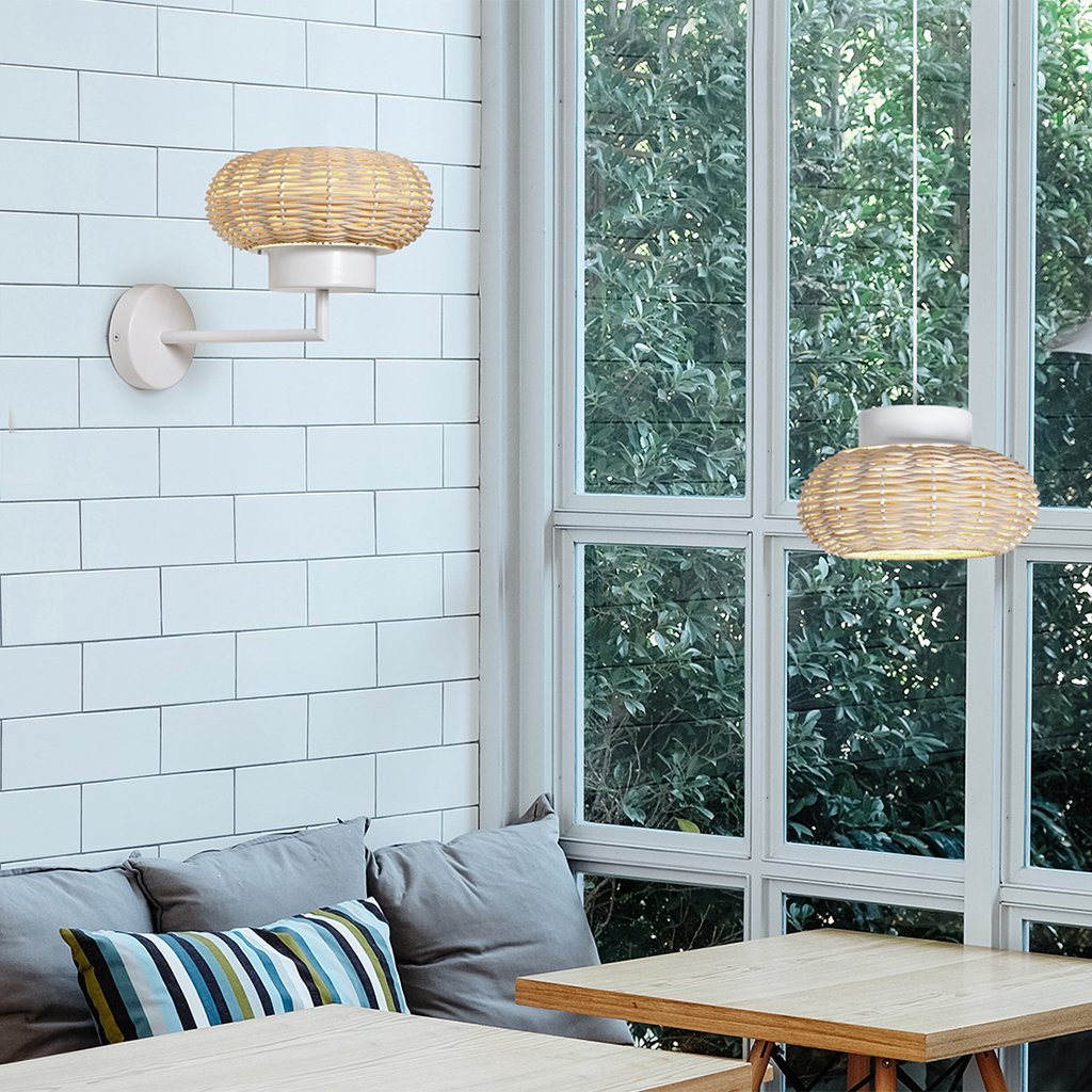 Svítidlo je vyrobené z kovu a přírodního proutí.