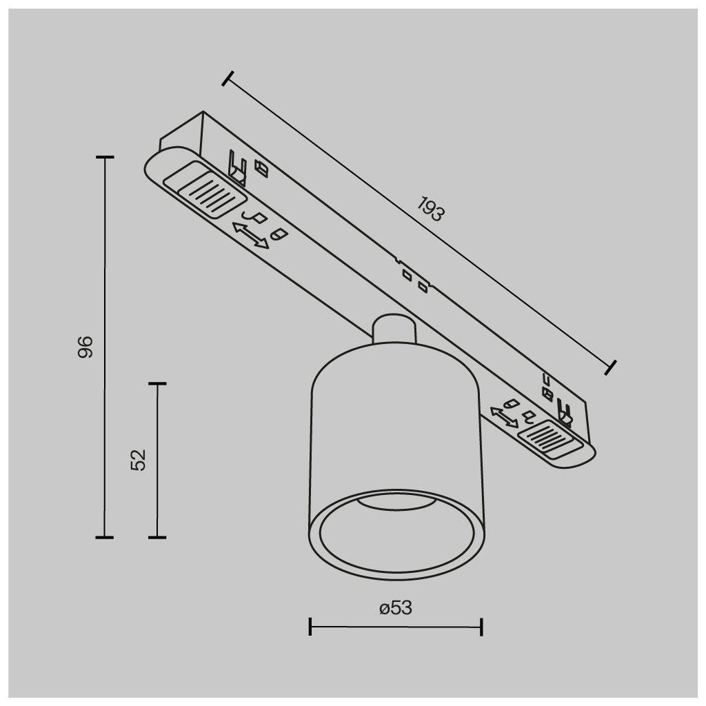 Rozměry samotného svítidla jsou ø53/52 mm, celkové rozměry včetně driveru do lišty jsou 193/53/96 mm. (d/š/v)