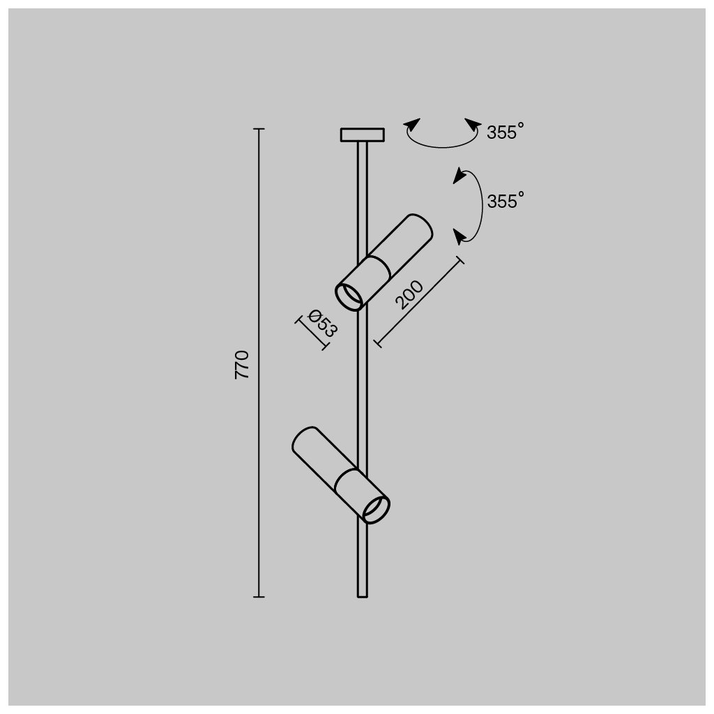 Rozměry hlavy svítidla jsou ø53/200 mm a rozměry fixní stropní základny jsou ø70/770 mm.