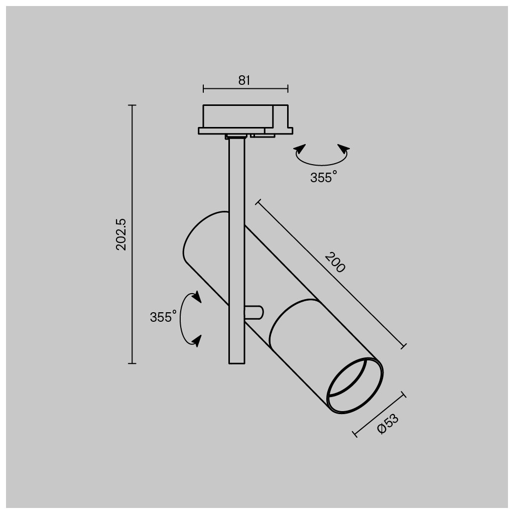 Rozměry hlavy svítidla jsou ø53/200 mm a rozměry základny jsou 81/202,5 mm. (d/v)
