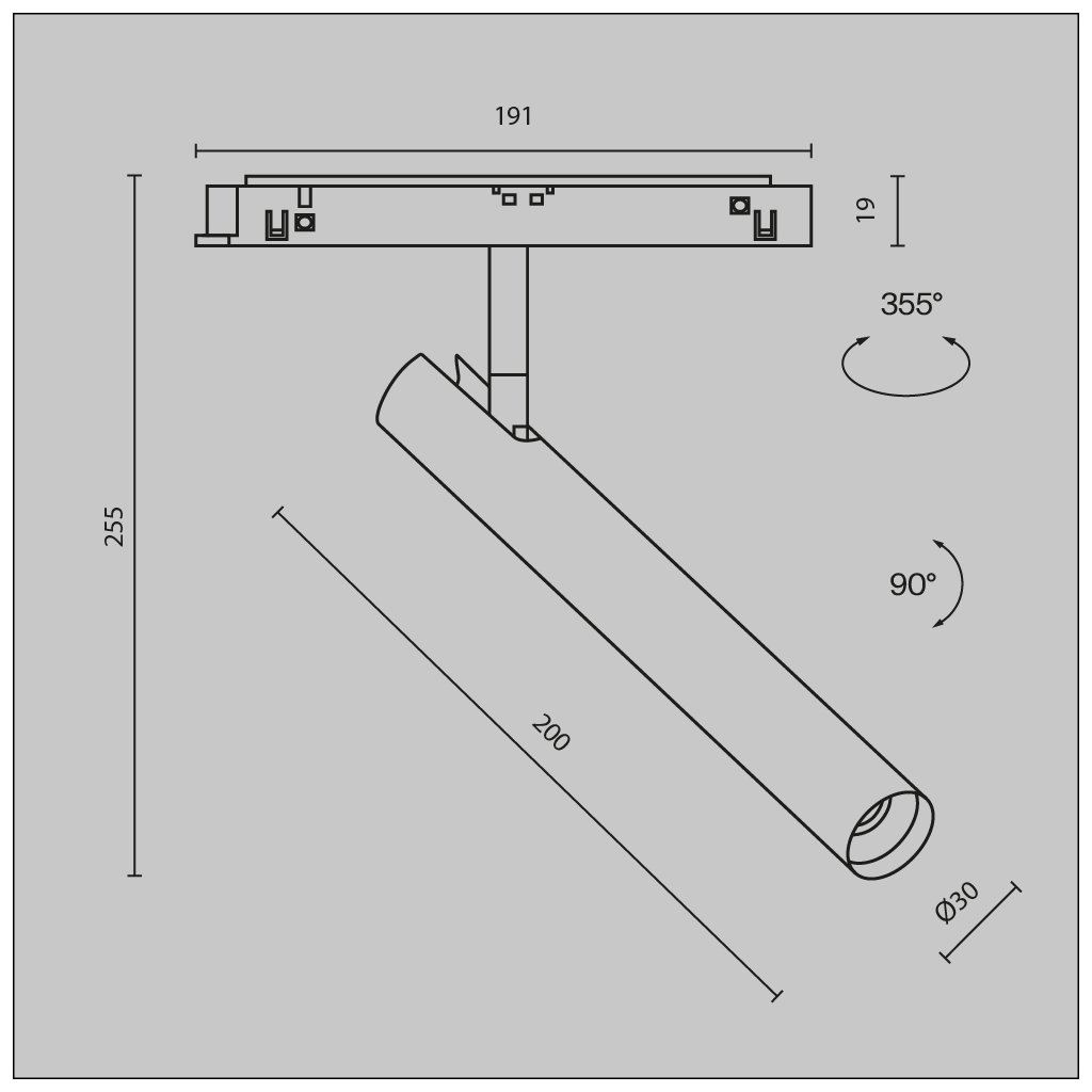 Rozměry hlavy svítidla jsou ø30/200 mm a celkové rozměry svítidla jsou 191/30/255 mm. (d/š/v).