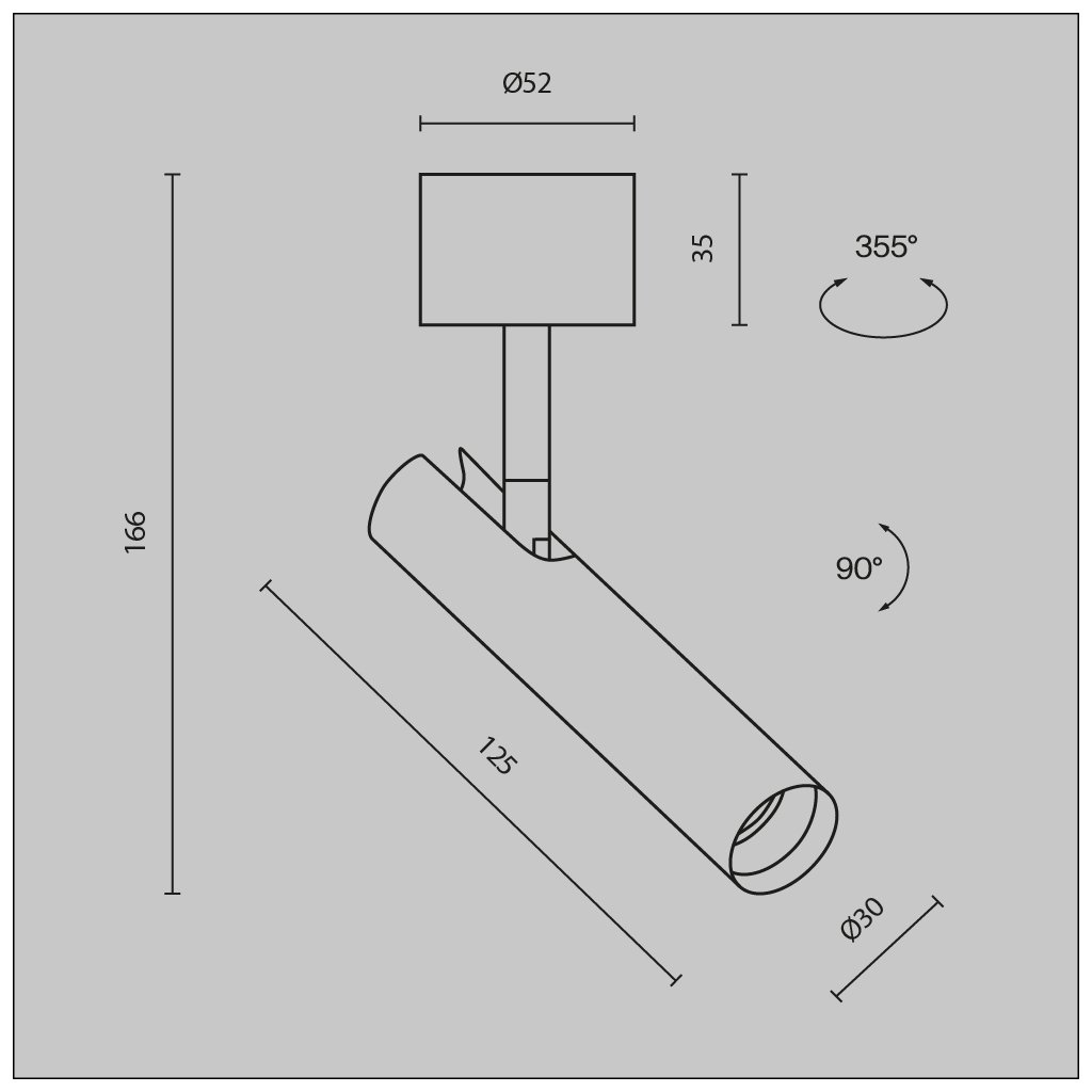 Svítidlo je dostupné ve dvou velikostech hlavy - ø30/125 mm s celkovou výškou 166 mm a ø30/300 mm s celkovou výškou 341 mm. Rozměry základny jsou pro obě varianty stejné - ø52/35 mm.
