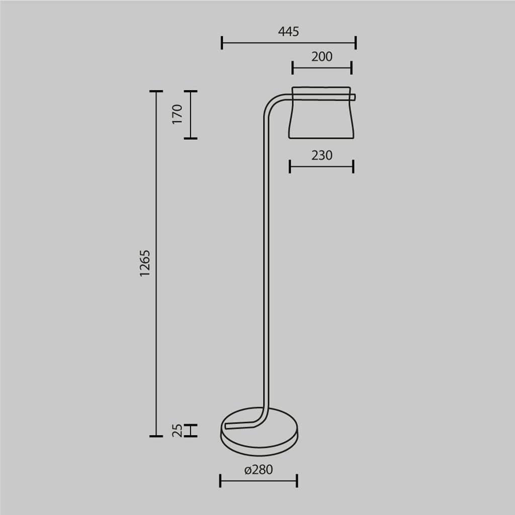 Rozměry hlavy svítidla jsou 230/127/170 mm (d/š/v) a celkové rozměry svítidla jsou 445/280/1265 mm (d/š/v).