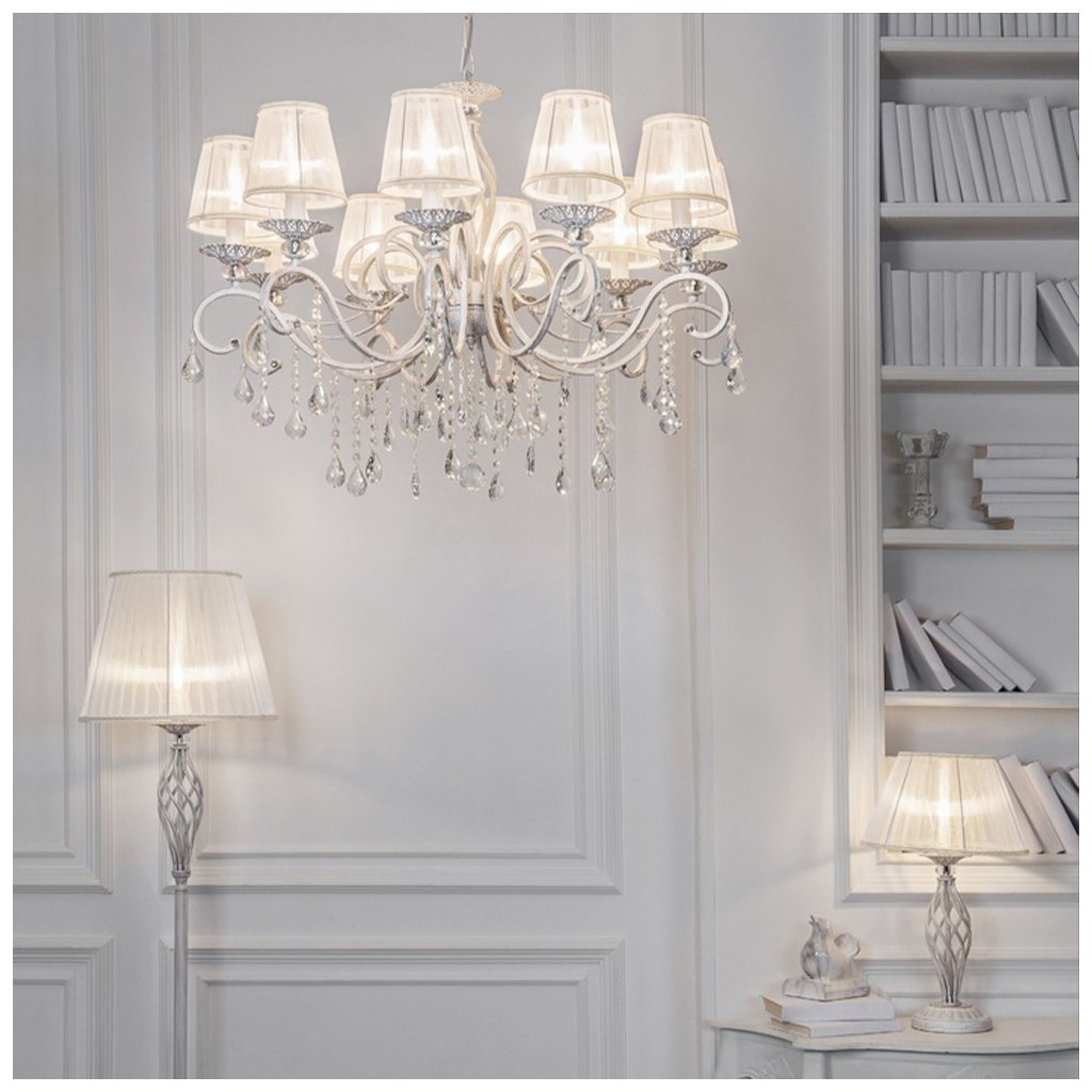 Svítidlo je vyrobeno z kovu, skla a textilu.