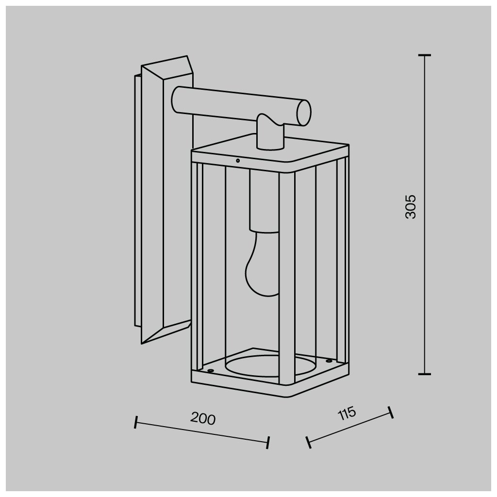 Rozměry svítidla jsou 200/115/305 mm. (d/š/v)