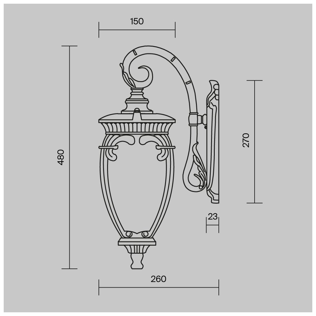 Rozměry hlavy svítidla jsou ø150/480 mm a celkové rozměry svítidla jsou 260/150/480 mm. (d/š/v)