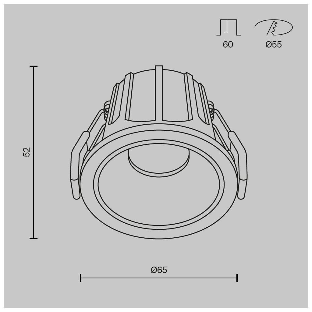 Svítidlo je dostupné ve dvou velikostech: ø65/52 mm (minimální zápustná hloubka je 60 mm) a ø85/63 mm (minimální zápustná hloubka je 70 mm).
