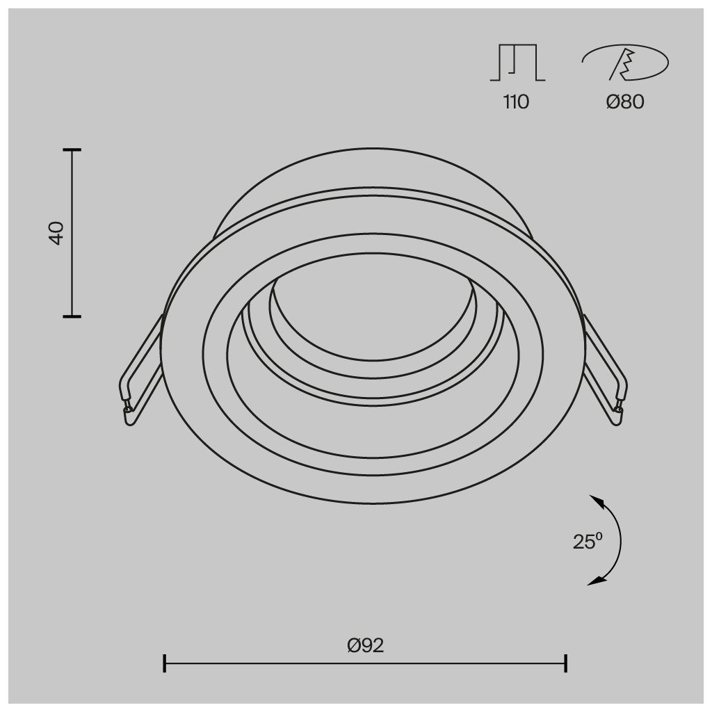 Rozměry svítidla jsou ø92/40 mm, minimální výška nad podhledem je 110 mm.