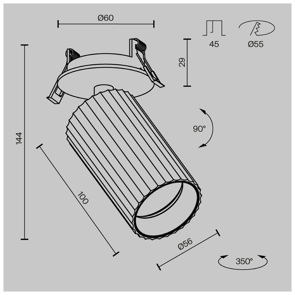 Rozměry hlavy svítidla jsou ø56/100 mm, rozměry základny svítidla jsou ø60/29 mm a minimální zápustná hloubka nad podhledem je 45 mm.