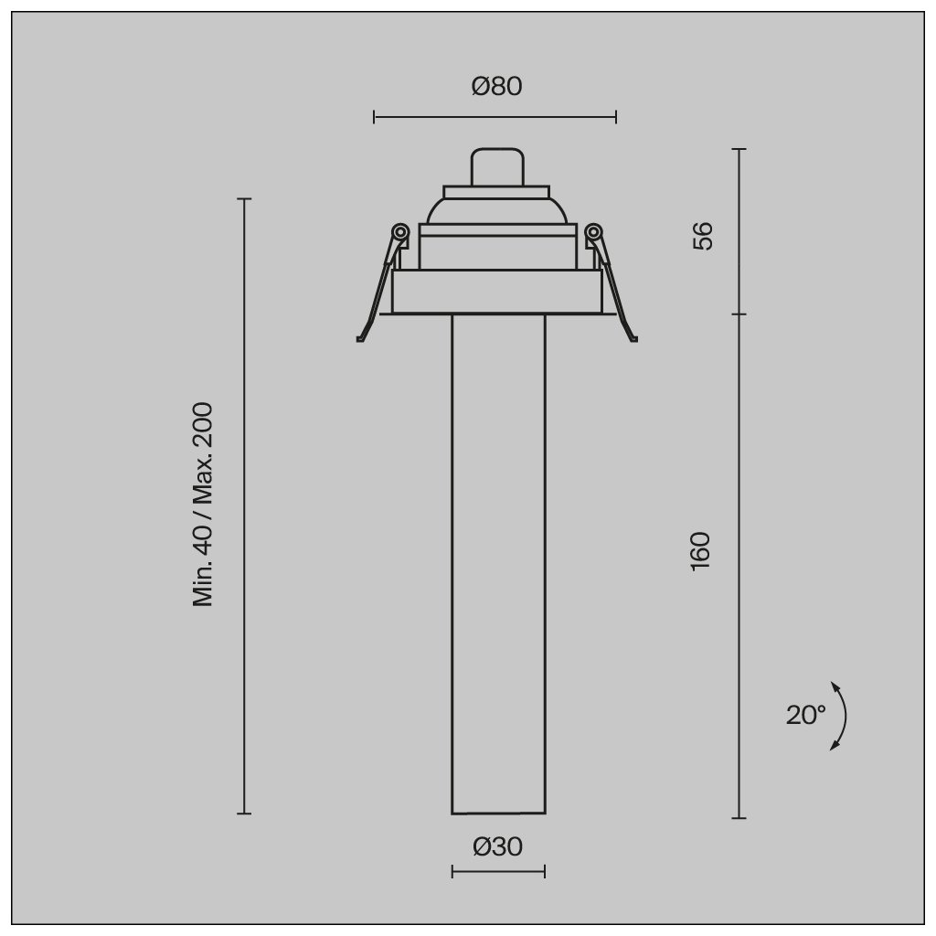 Svítidlo je dostupné ve dvou velikostech - ø30/216 mm a ø30/316 mm. Rozměry zabudované základny jsou ø80/56 mm.