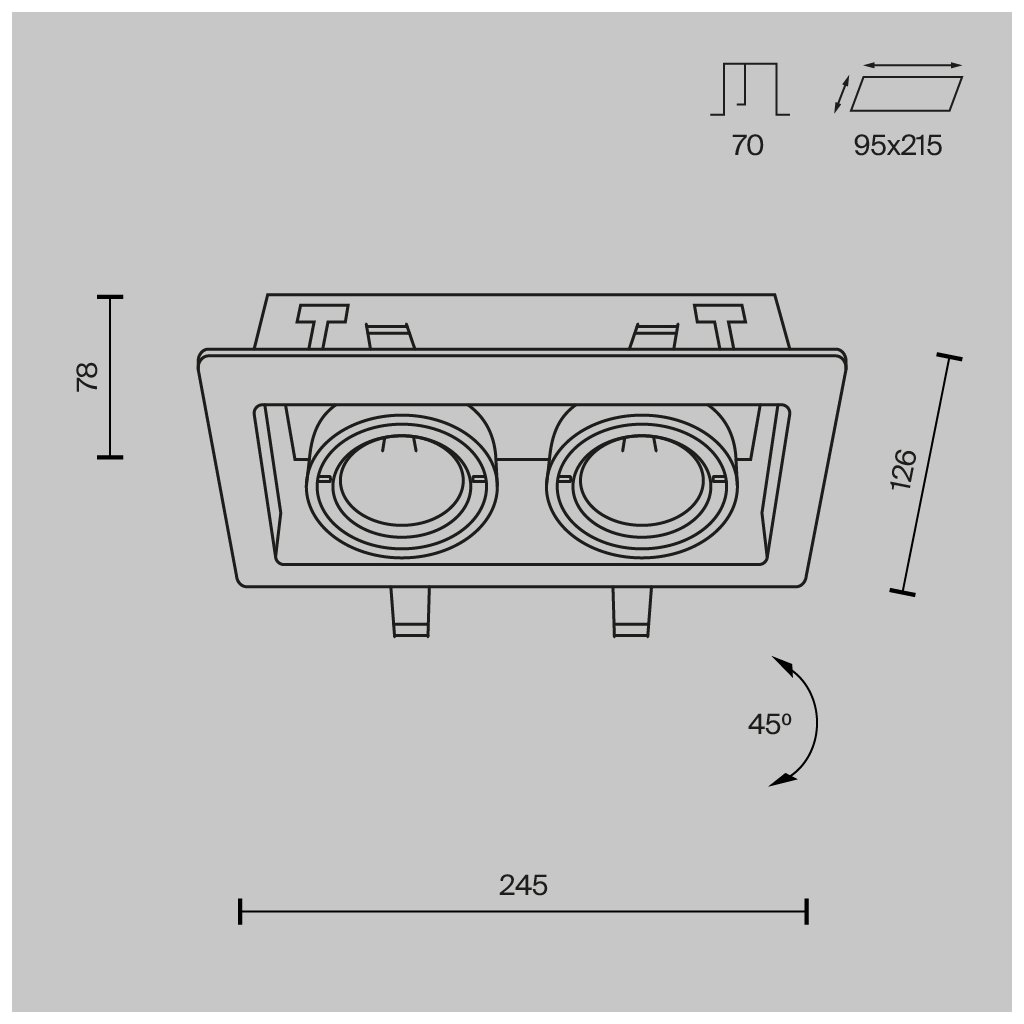 Rozměry svítidla jsou 245/126/78 mm, minimální výška nad podhledem je 80 mm.
