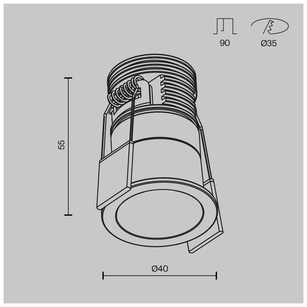 Svítidlo je dostupné ve dvou velikostech - ø40/55 mm (minimální zápustná hloubka je 90 mm) a ø60/82 mm (minimální zápustná hloubka je 110 mm).
