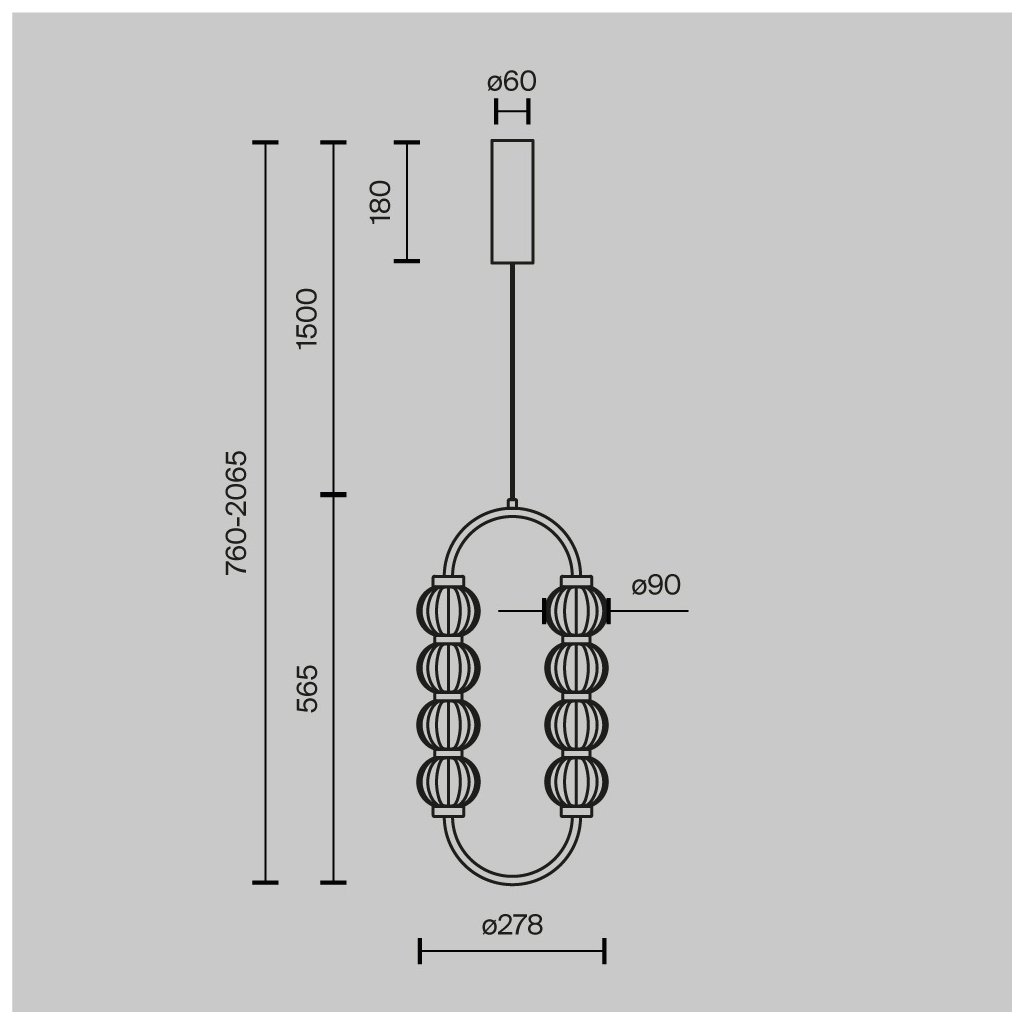 Součástí je válcová stropní rozeta v barvě svítidla s rozměry ø60/180 mm a nastavitelný kabelový závěs svítidla, kdy je možné nastavit celkovou výšku svítidla mezi 760-2065 mm.