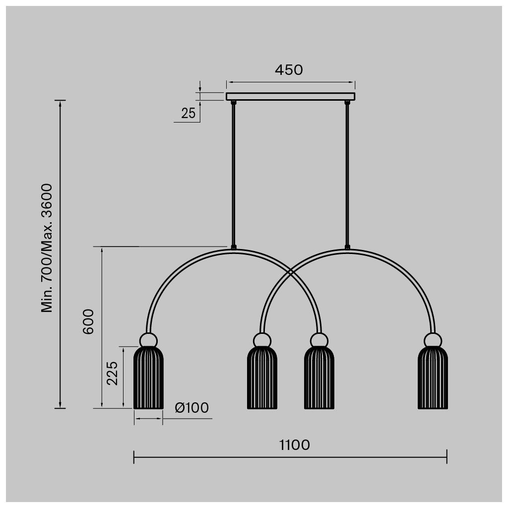 Součástí je stropní rozeta s rozměry 450/25 mm a nastavitelný kabelový závěs svítidla, kdy je možné nastavit celkovou výšku svítidla mezi 700-3600 mm.