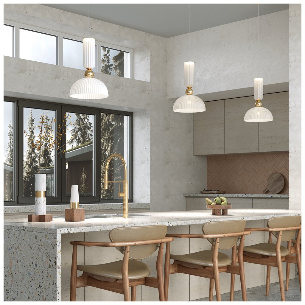 Skleněné svěšené svítidlo Antic kombinuje retro prvky se současnými trendy, přičemž dosahuje dokonalé rovnováhy mezi klasickými proporcemi a moderními inovacemi. Nápadné závěsné svítidlo Antic ztělesňuje eleganci a harmonii bez nadměrné zdobnosti. Žebrovaná struktura skleněných stínítek navíc zesiluje odrazy světla, čímž dodává svítidlu hloubku a jedinečnost.