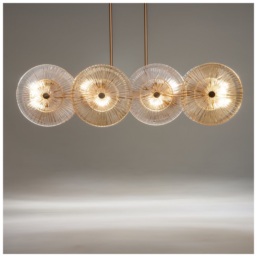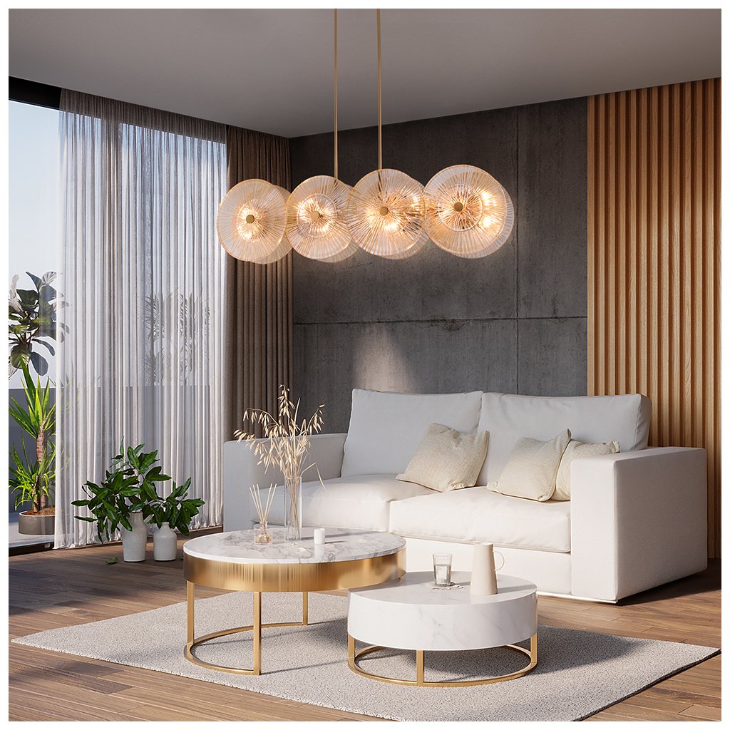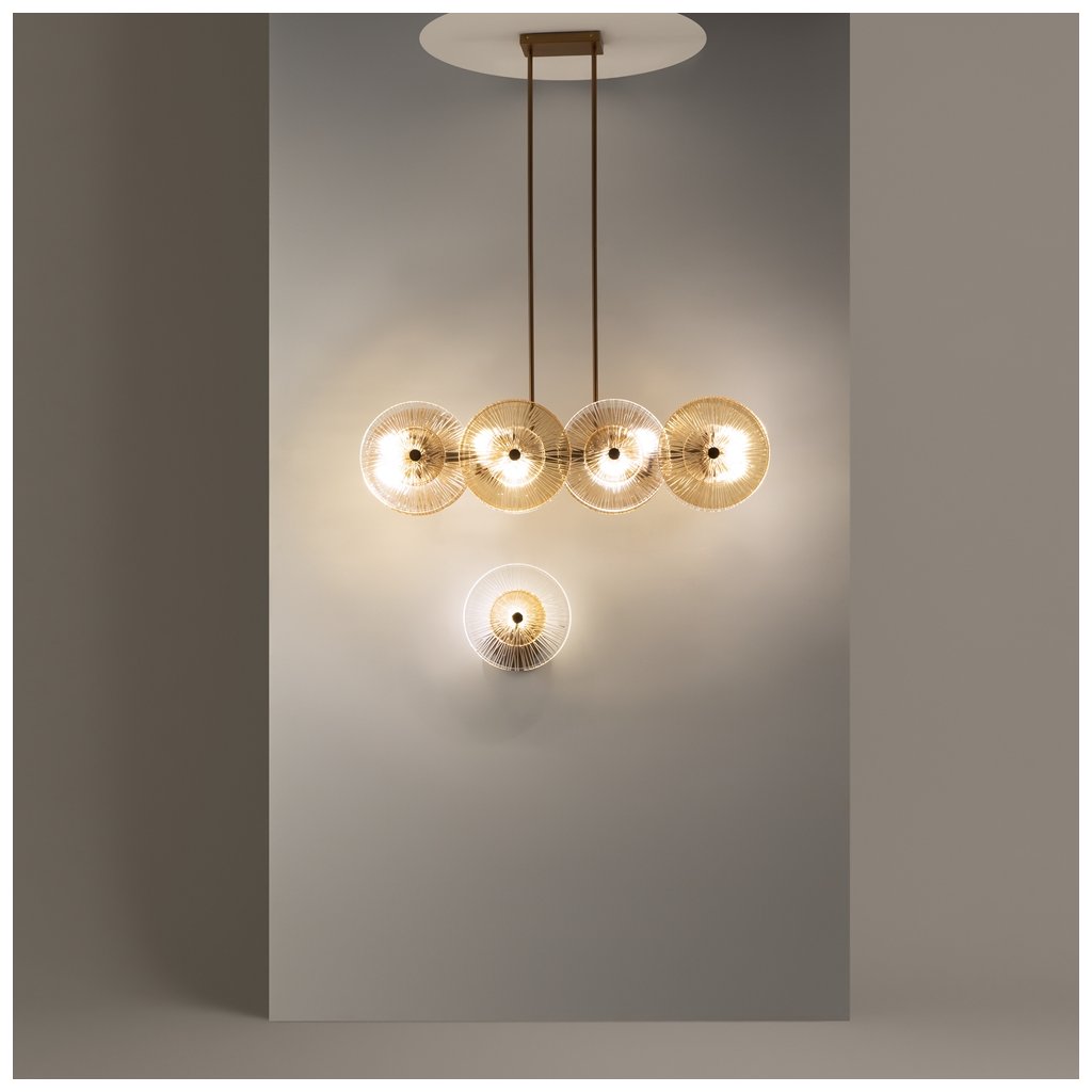 Elegantní závěsné svítidlo Aster Linear ztělesňuje bohémského ducha obohaceného o prvky art deco. Jádrem designu luxusního svítidla Aster Linear jsou sférické komponenty vyrobené ze skla ve dvou barvách: čiré a jantarové. Texturovaný povrch stínidel odráží současné designové trendy, zatímco zlatý kovový rám podtrhuje nadčasovou sofistikovanost art deco.