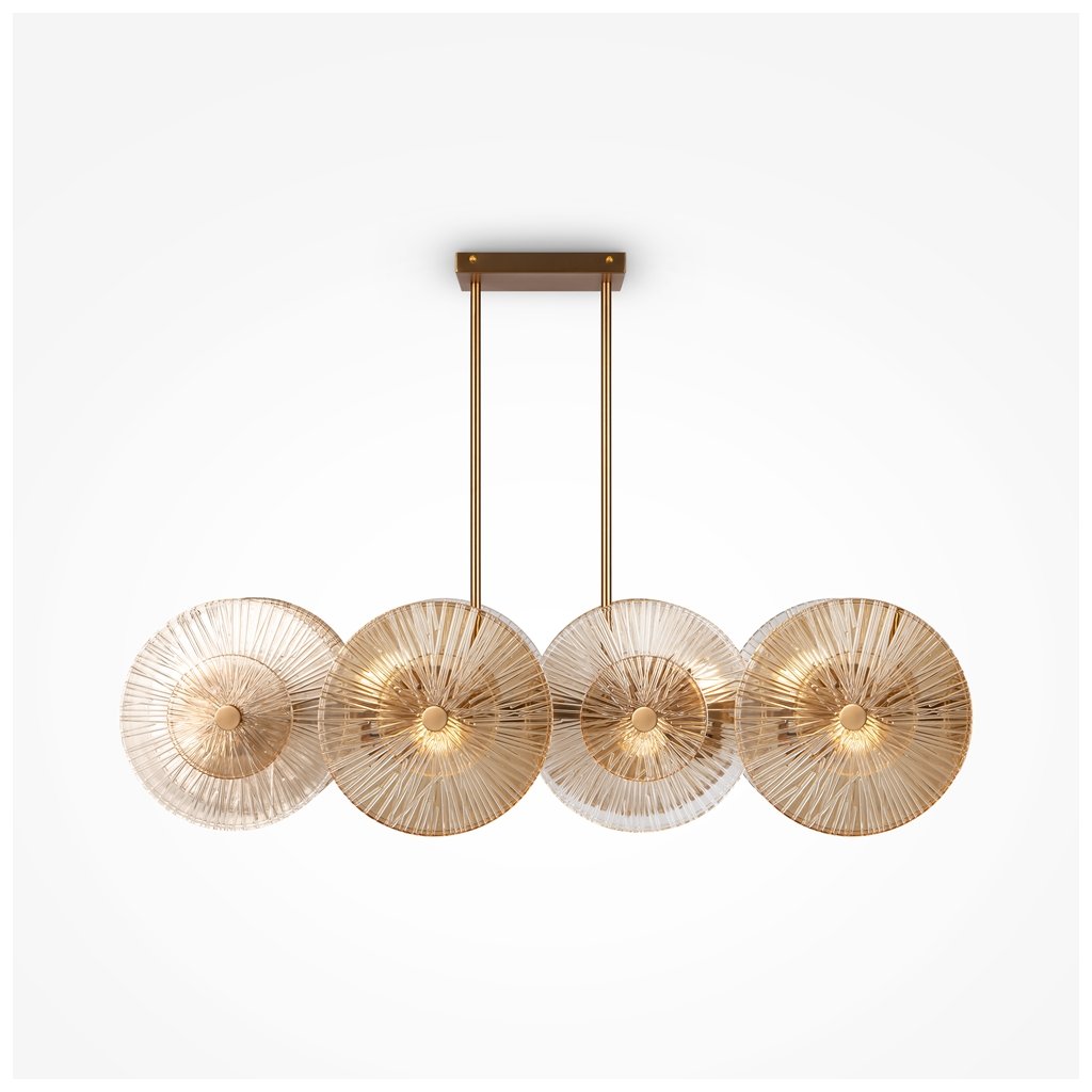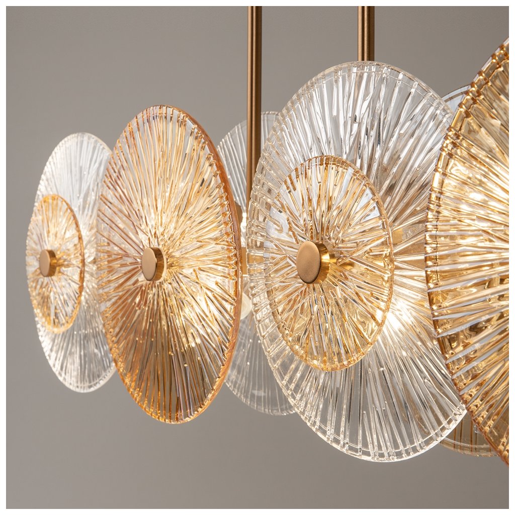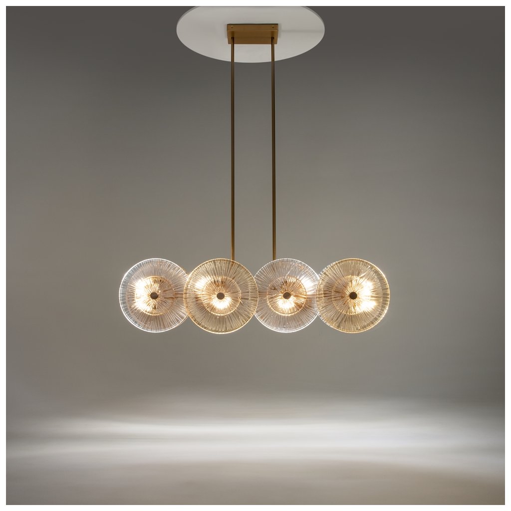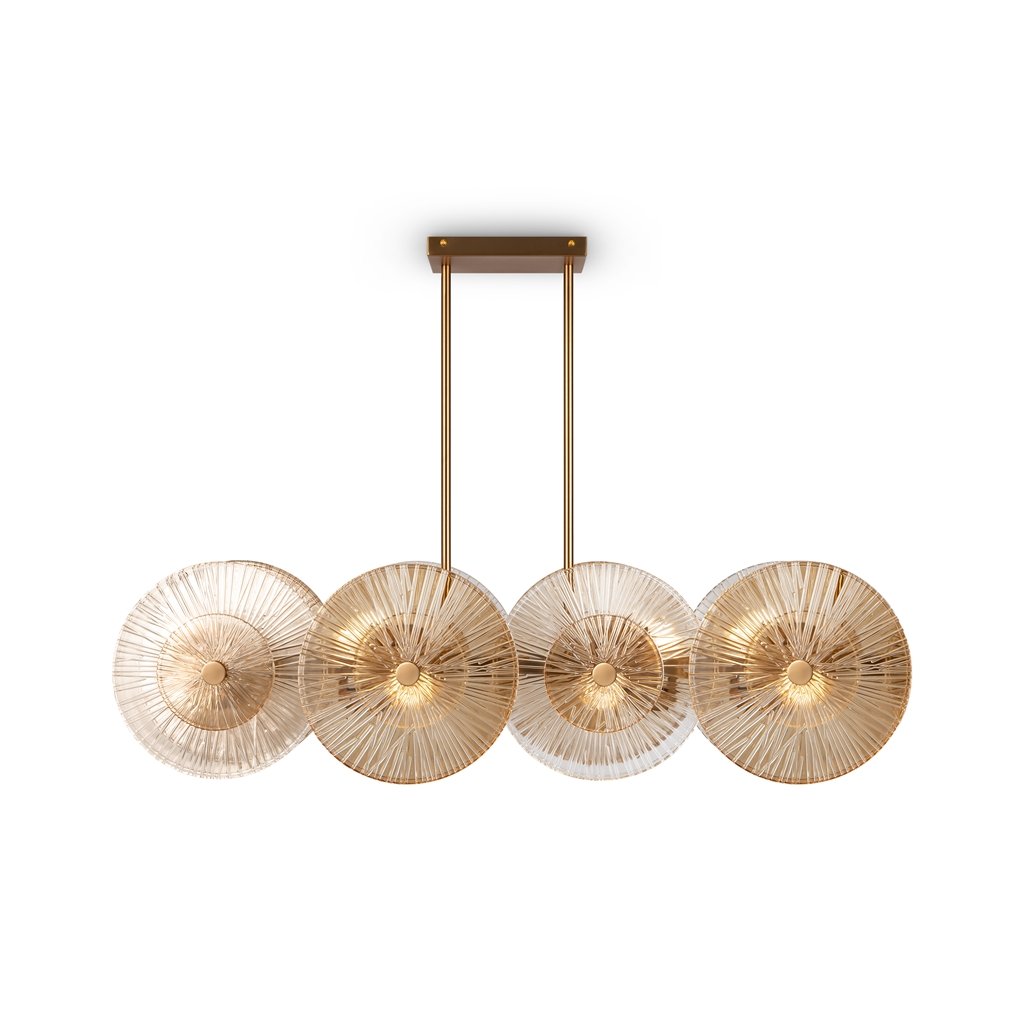 Elegantní závěsné svítidlo Aster Linear ztělesňuje bohémského ducha obohaceného o prvky art deco. Jádrem designu luxusního svítidla Aster Linear jsou sférické komponenty vyrobené ze skla ve dvou barvách: čiré a jantarové. Texturovaný povrch stínidel odráží současné designové trendy, zatímco zlatý kovový rám podtrhuje nadčasovou sofistikovanost art deco.