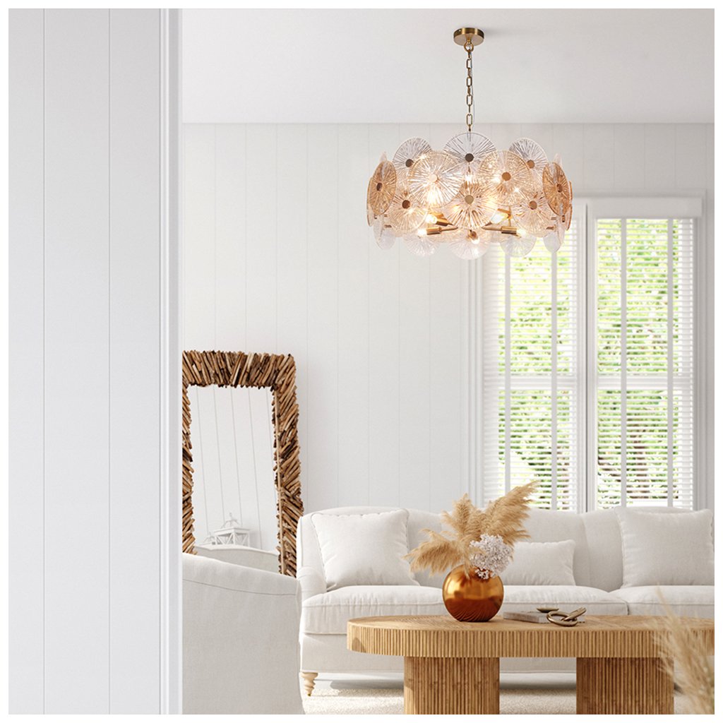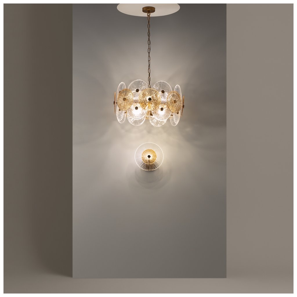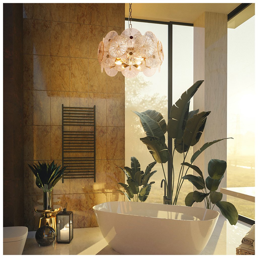 Elegantní závěsné svítidlo Aster ztělesňuje bohémského ducha obohaceného o prvky art deco. Jádrem designu luxusního svítidla Aster jsou sférické komponenty vyrobené ze skla ve dvou barvách: čiré a jantarové. Texturovaný povrch stínidel odráží současné designové trendy, zatímco zlatý kovový rám podtrhuje nadčasovou sofistikovanost art deco.
