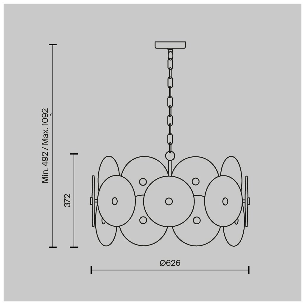 Součástí je válcová stropní rozeta v barvě svítidla a nastavitelný řetězový závěs svítidla, kdy je možné nastavit celkovou výšku svítidla mezi 492-1092 mm.