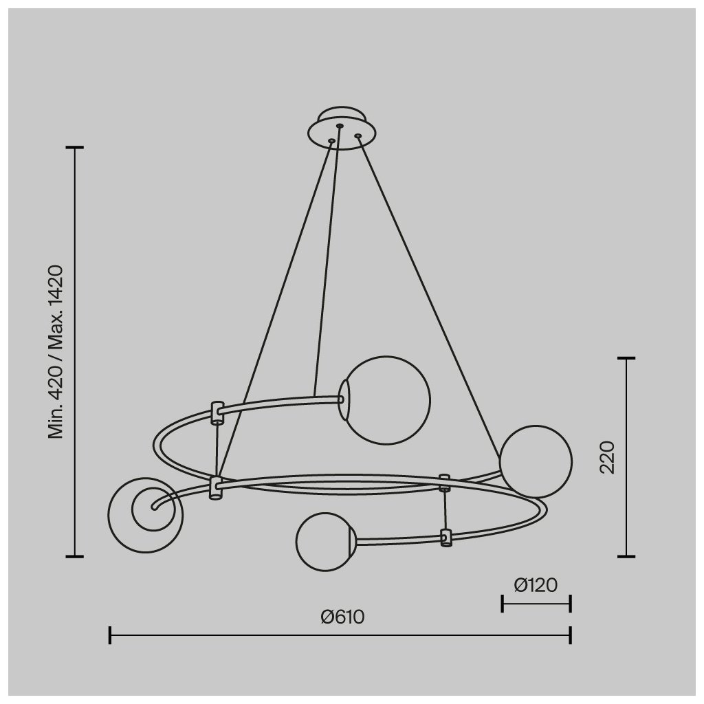 Rozměry svítidla jsou ø610/220 mm, průměr každé z koulí je 120 mm.