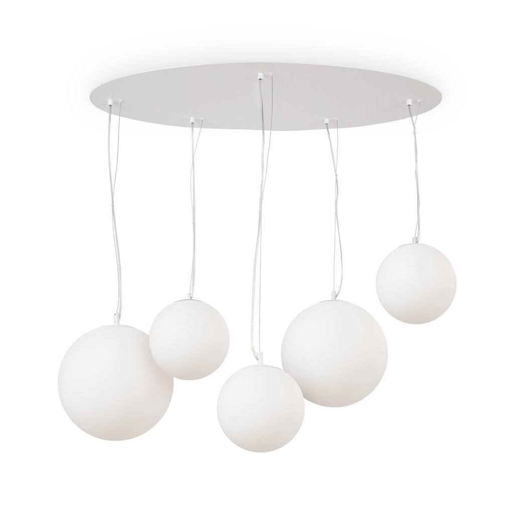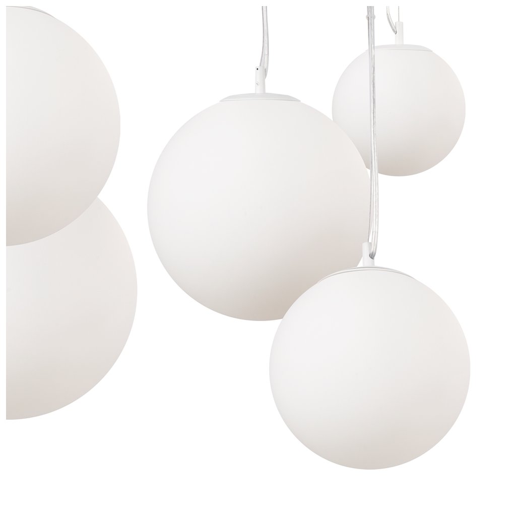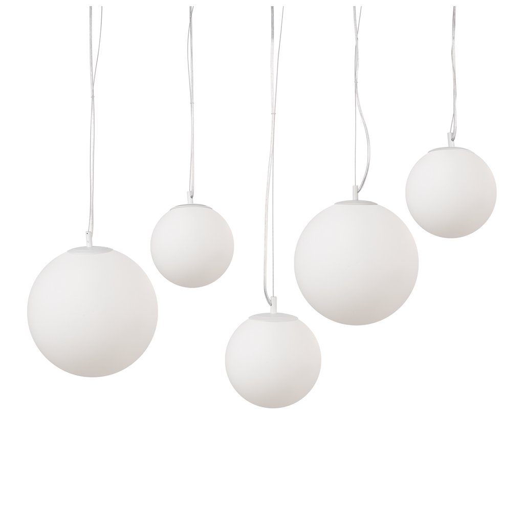 Pět patic E27 pro vyměnitelné žárovky pro variantu s bílým sklem a bílým tělem. (Žárovky nejsou součástí balení.)