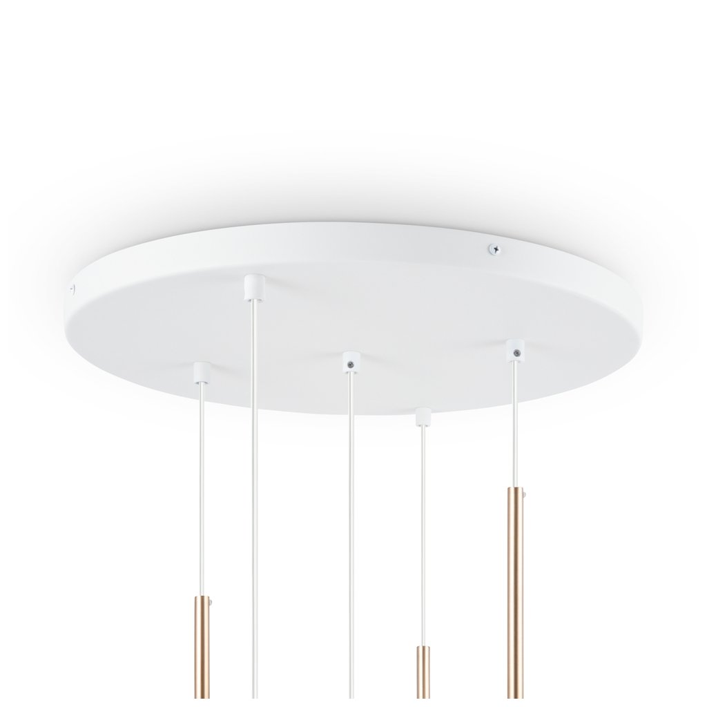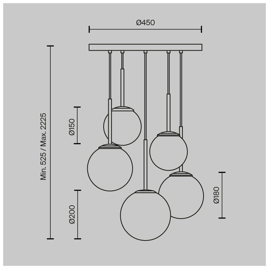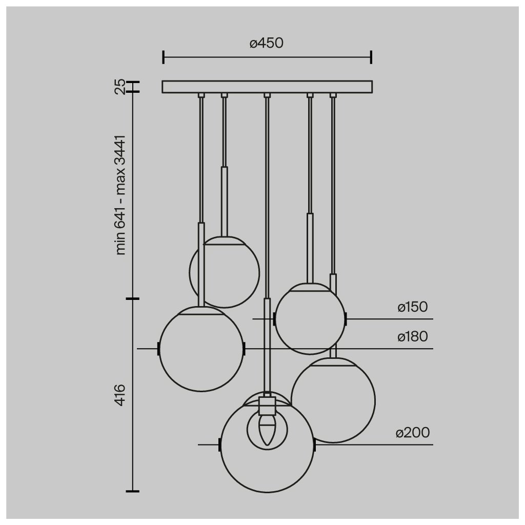 Součástí je stropní válcová rozeta s rozměry ø450/25 mm pro varianty s černým nebo zlatým tělem nebo stropní oválná rozeta s rozměry 1000/400 mm (d/š) pro variantu s bílým sklem a bílým tělem a nastavitelný závěs pro každé ze svítidel.