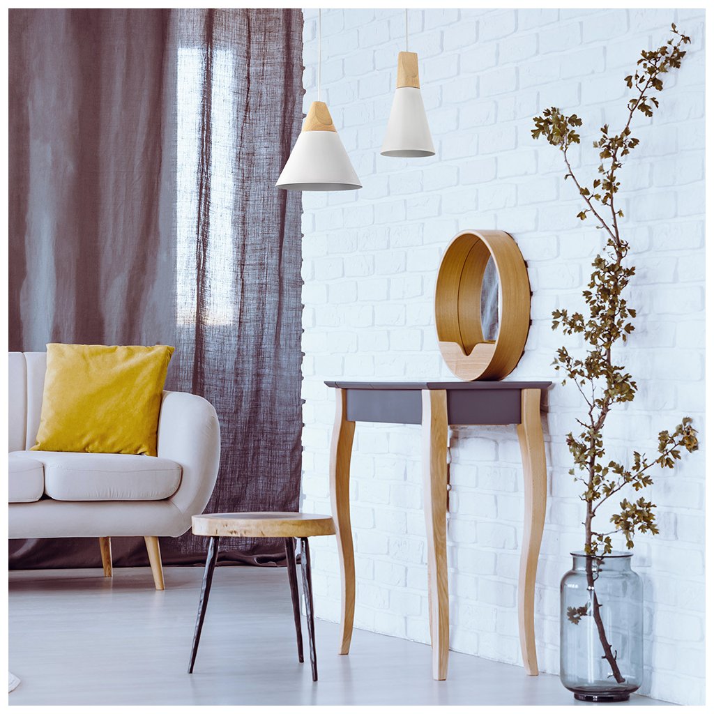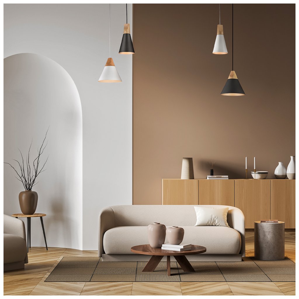 Kuželové závěsné svítidlo Bicones odráží podstatu skandinávského designu díky promyšlené kombinaci materiálů a barev. Svítidlo se vyznačuje dekorativním prvkem z lakovaného bukového dřeva, který slouží jako výrazný akcent spodního stínítka z kovu dostupného ve dvou barvách.
