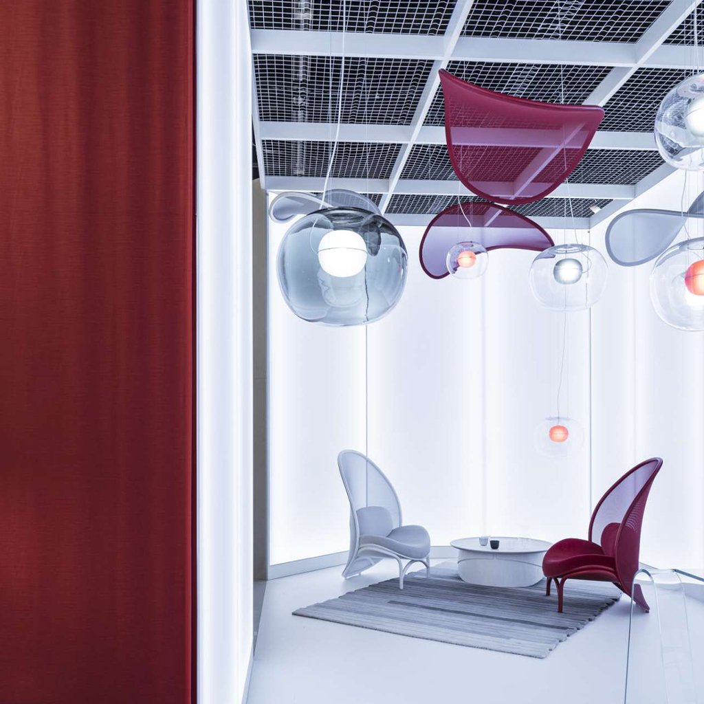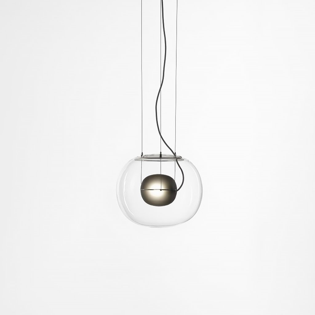 Sofistikovaný design bubliny z matného skla zavěšené ve středu koule z lesklého skla navozuje pocit levitace a inoskulace svítících těles s klíčovým důrazem na jejich vzájemnou interakci v prostoru. Toto velkoformátové svítidlo ztělesňuje jemnou poezii, jednoduchost, čistotu a vyvážené proporce.