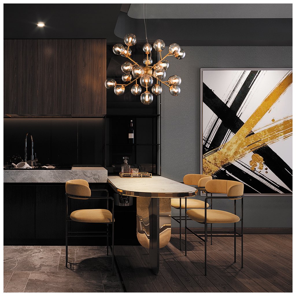 Velké umělecké svěšené svítidlo Dallas 24 tvořené četnými foukanými skleněnými koulemi. Tónované nebo čiré odstíny skleněných stínítek příjemně rozptylují a zjemňují světlo a vytvářejí krásné odlesky. Toto elegantní svítidlo zaujme jako centrální solitér v jakékoli ložnici, obývacím pokoji nebo chodbě, ale i v komerčních prostorech jako jsou butiky, recepce, lobby, restaurace, obchody nebo hotely.