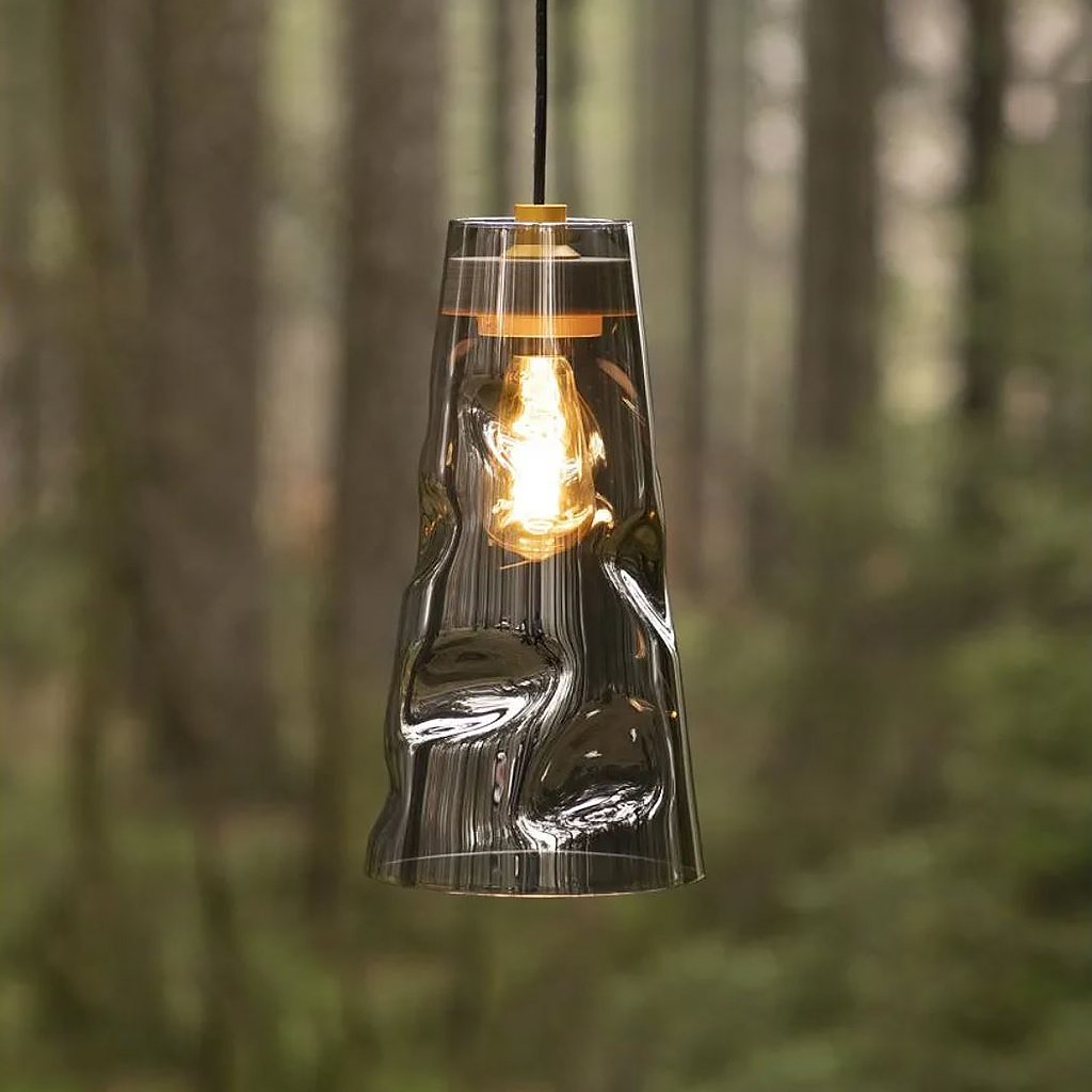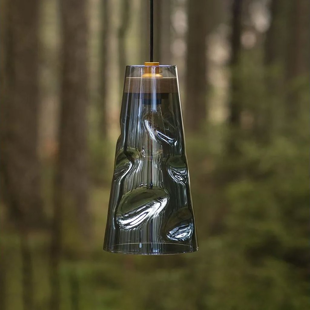 Svítidlo je vyrobené z ručně foukaného skla, dubového dřeva a kovu.