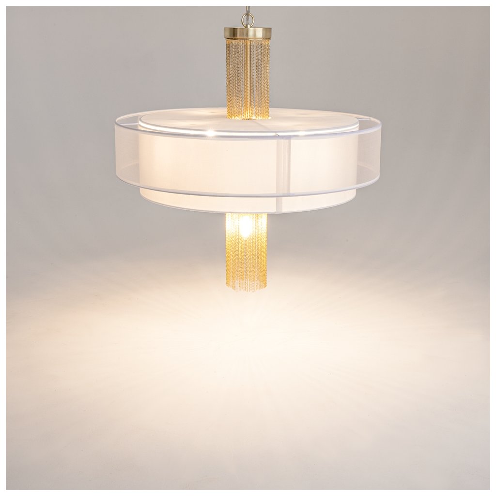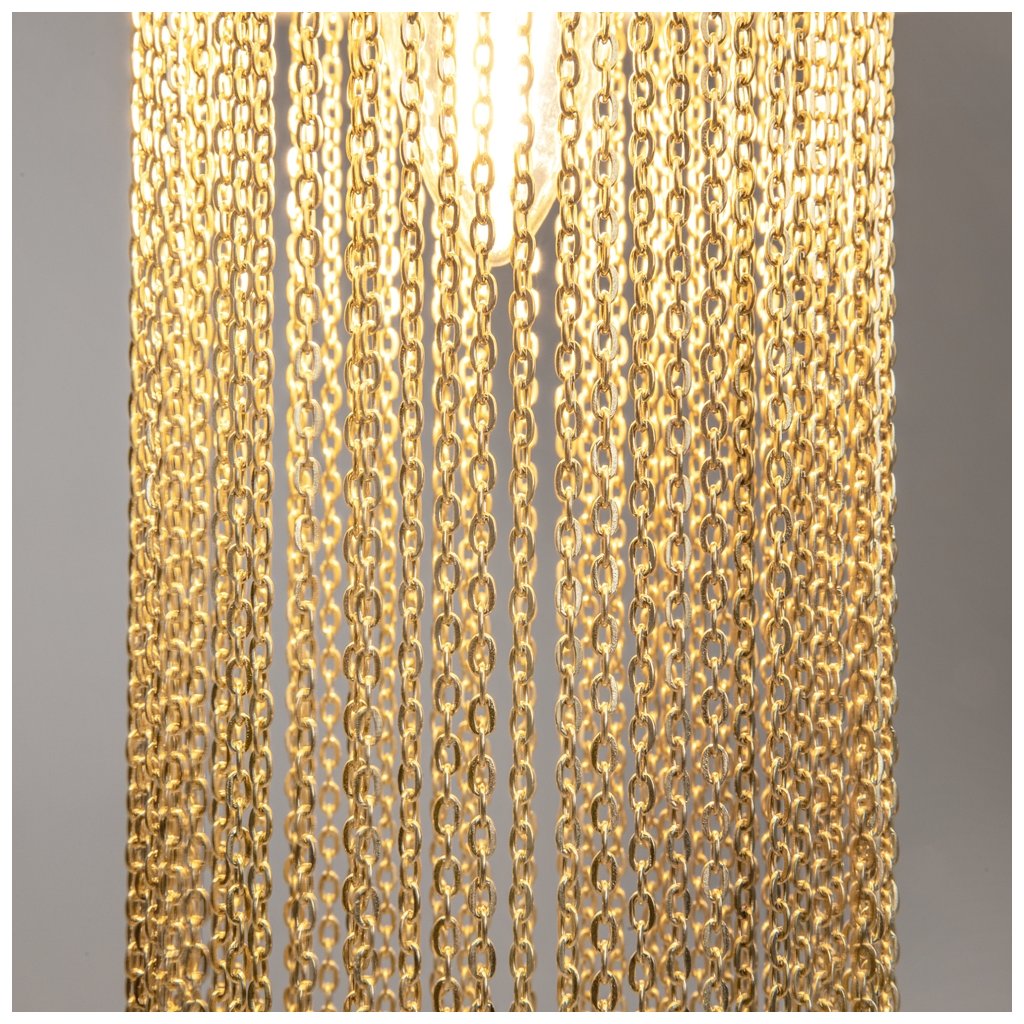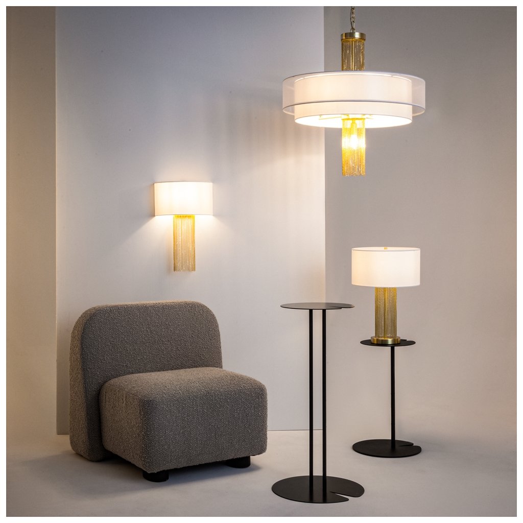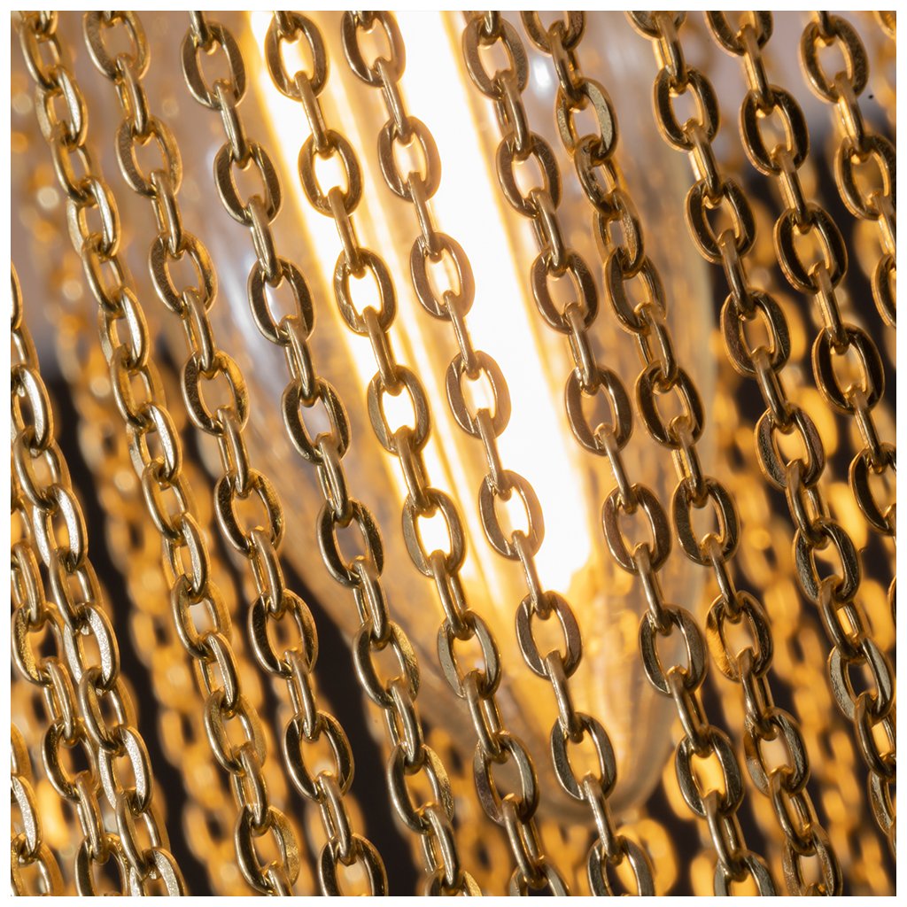 - Elegantní svěšené svítidlo Impressive připomínající zlatý šperk zaujme kombinací luxusních materiálů a odvážného designu. Středobodem svítidla jsou rozptýlené zlaté řetízky orámované dvěma sněhově bílými látkovými stínítky, které propouští příjemné světlo. Naopak žárovka ve spodní části vyzařuje světlo mezi řetízky, čímž vytváří hru světla a stínů a přitahuje pozornost. Díky svému poutavému vzhledu se svítidlo hodí jak do moderních, tak i do klasických interiérů.