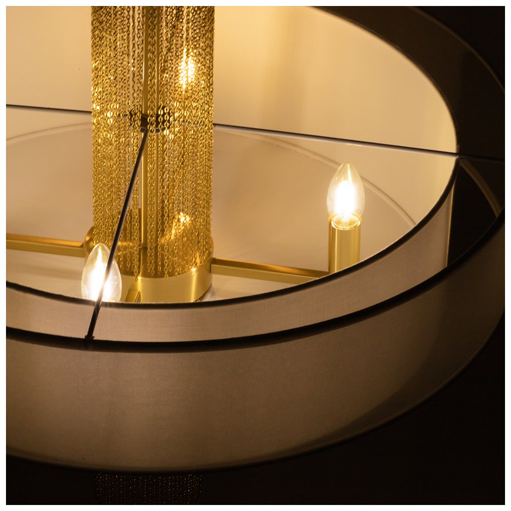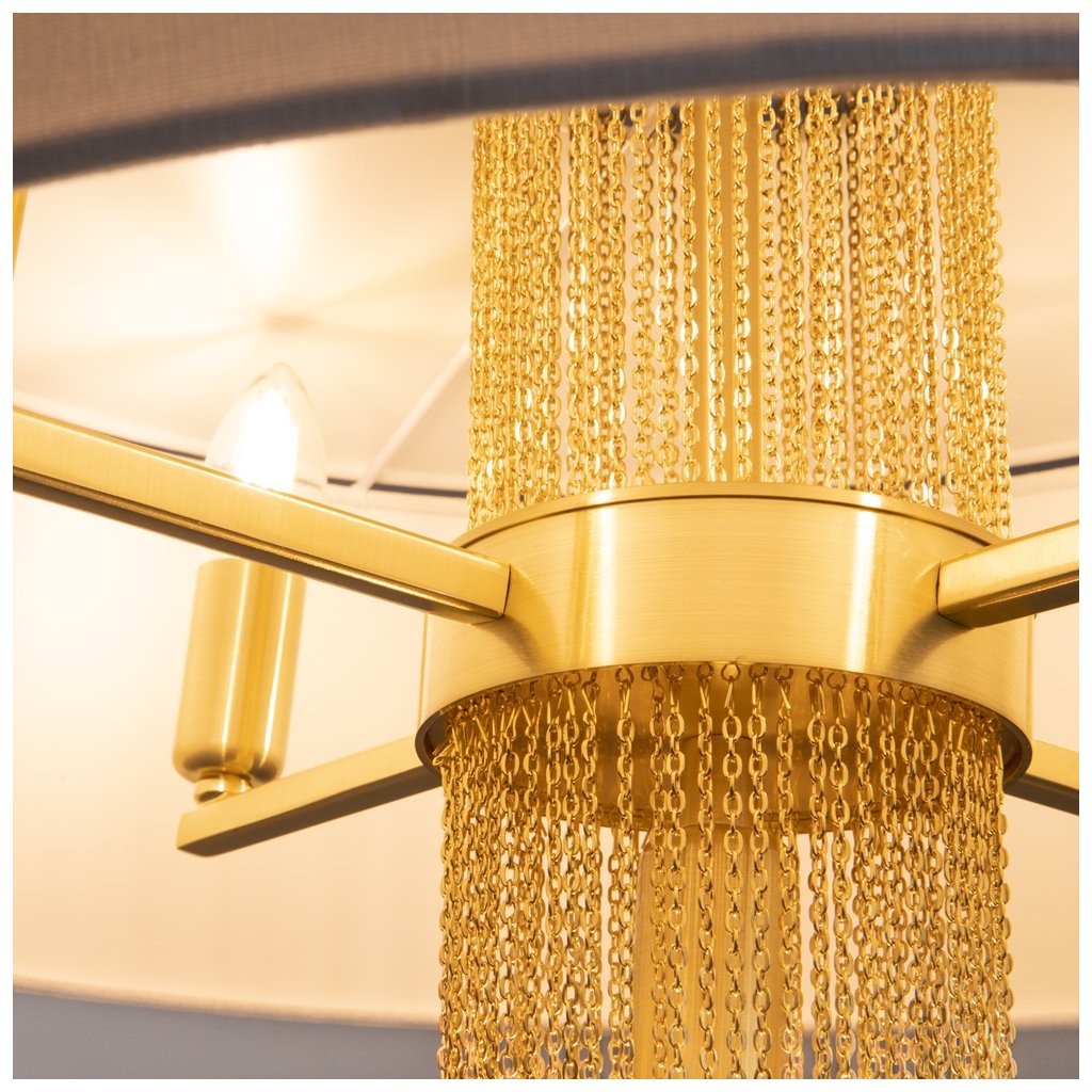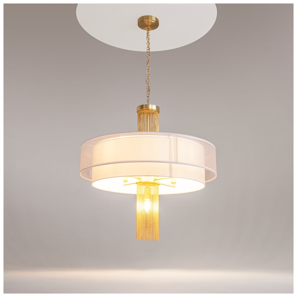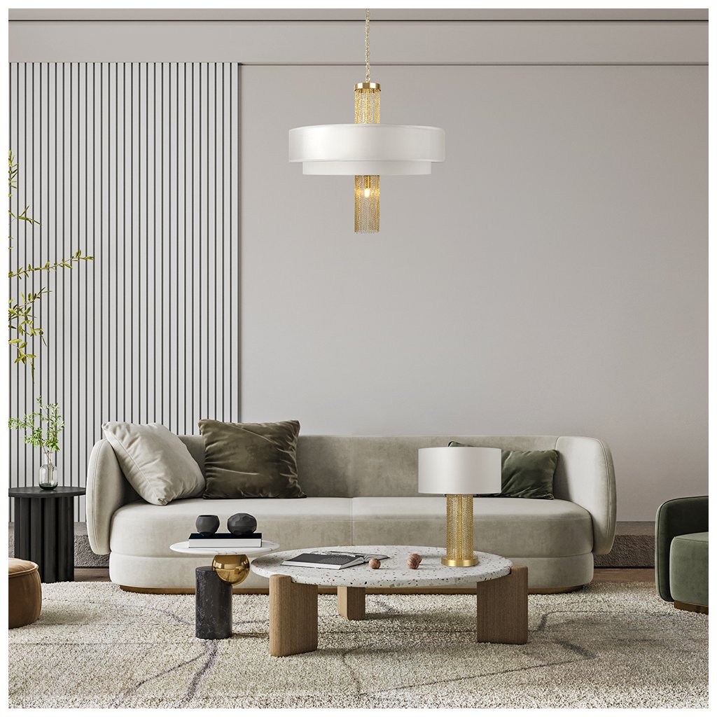 - Elegantní svěšené svítidlo Impressive připomínající zlatý šperk zaujme kombinací luxusních materiálů a odvážného designu. Středobodem svítidla jsou rozptýlené zlaté řetízky orámované dvěma sněhově bílými látkovými stínítky, které propouští příjemné světlo. Naopak žárovka ve spodní části vyzařuje světlo mezi řetízky, čímž vytváří hru světla a stínů a přitahuje pozornost. Díky svému poutavému vzhledu se svítidlo hodí jak do moderních, tak i do klasických interiérů.
