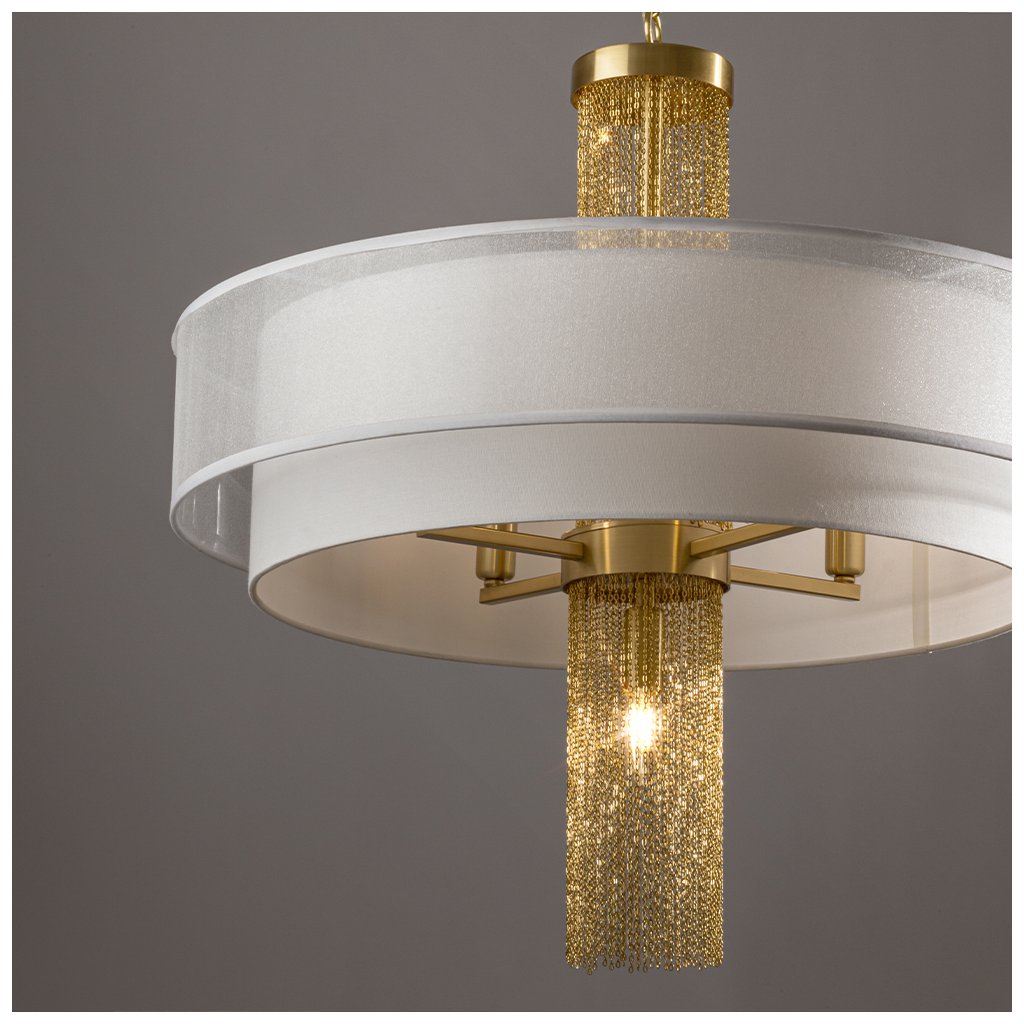 Elegantní svěšené svítidlo Impressive připomínající zlatý šperk zaujme kombinací luxusních materiálů a odvážného designu. Středobodem svítidla jsou rozptýlené zlaté řetízky orámované dvěma sněhově bílými látkovými stínítky, které propouští příjemné světlo. Naopak žárovka ve spodní části vyzařuje světlo mezi řetízky, čímž vytváří hru světla a stínů a přitahuje pozornost. Díky svému poutavému vzhledu se svítidlo hodí jak do moderních, tak i do klasických interiérů.