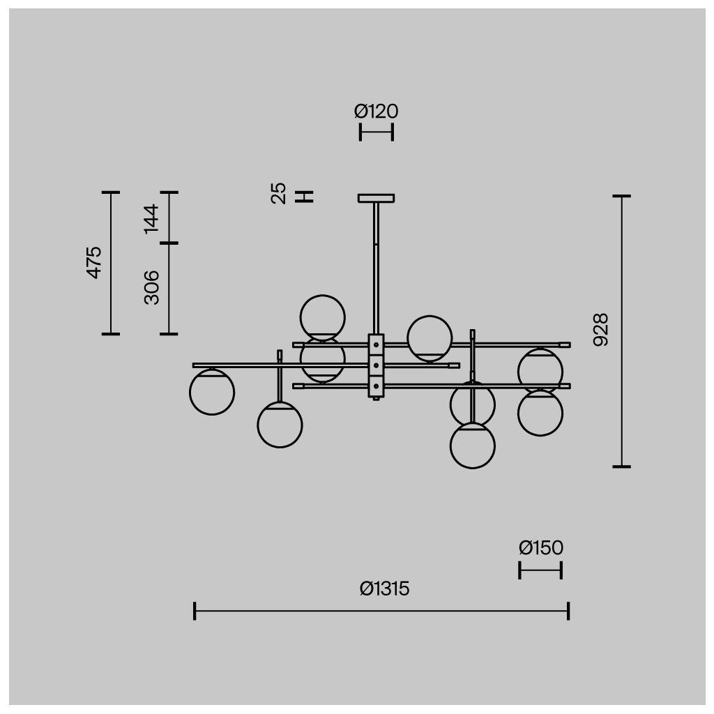 Rozměry svítidla jsou ø1315/586 mm, průměr každé z koulí je 150 mm.