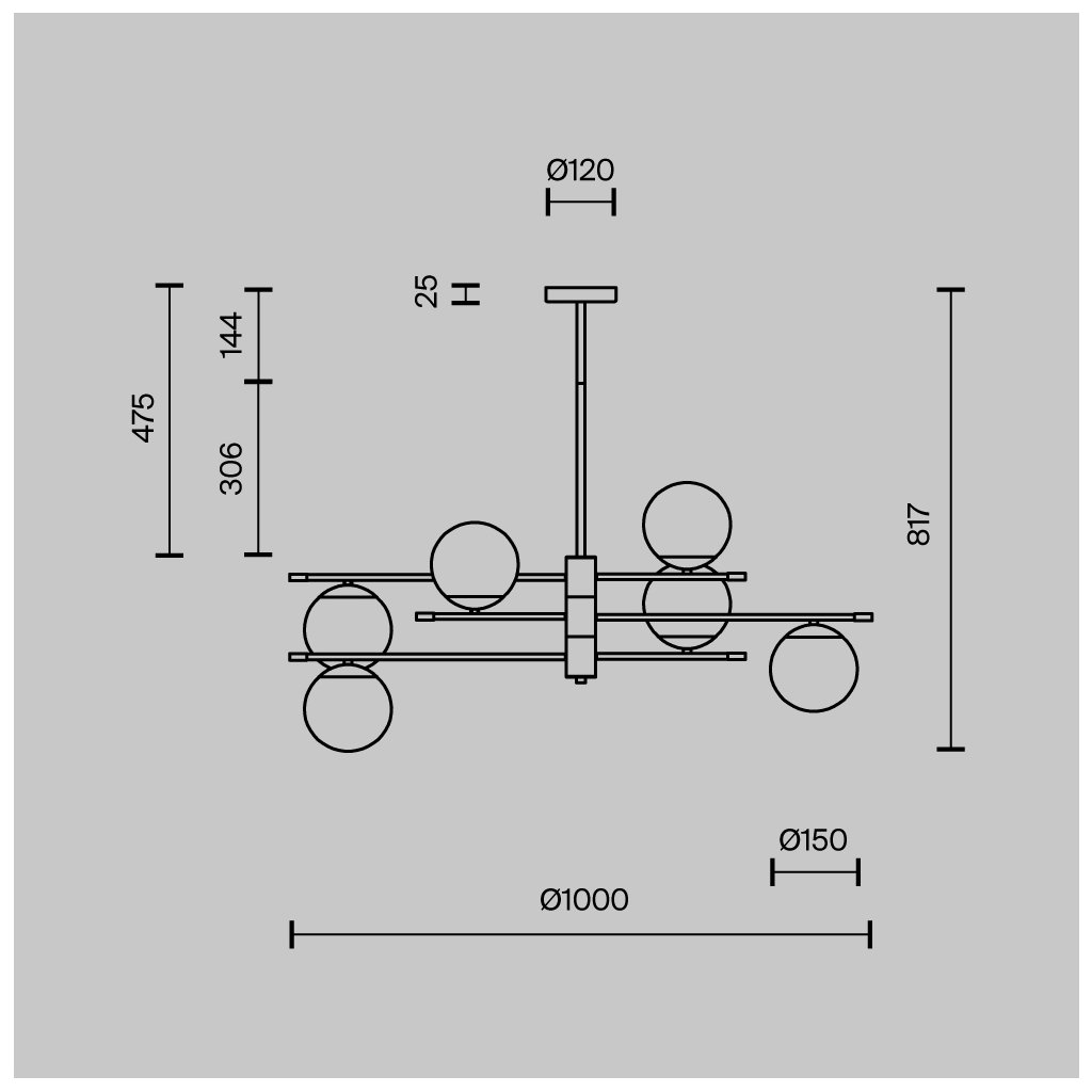Rozměry svítidla jsou ø1000/475 mm, průměr každé z koulí je 150 mm.