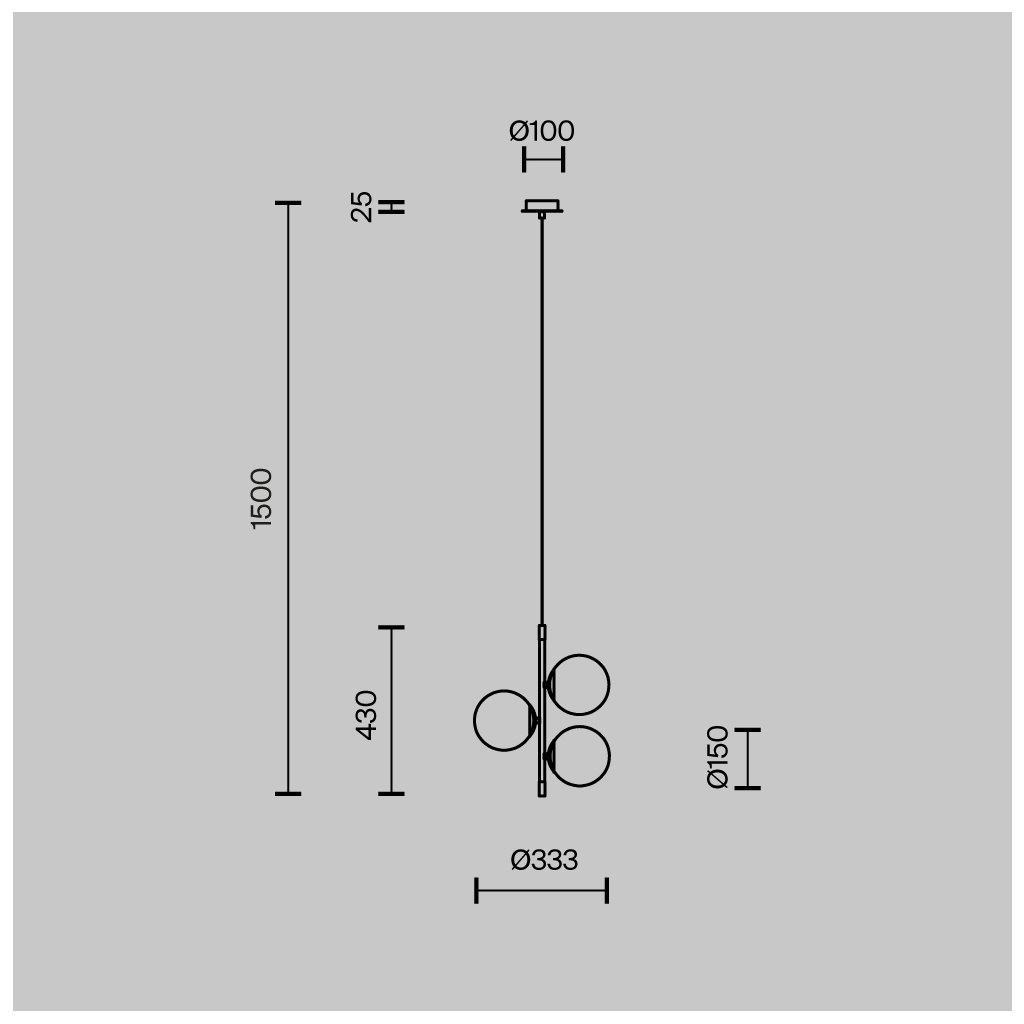 Rozměry svítidla jsou ø333/430 mm, průměr každé z koulí je 150 mm.