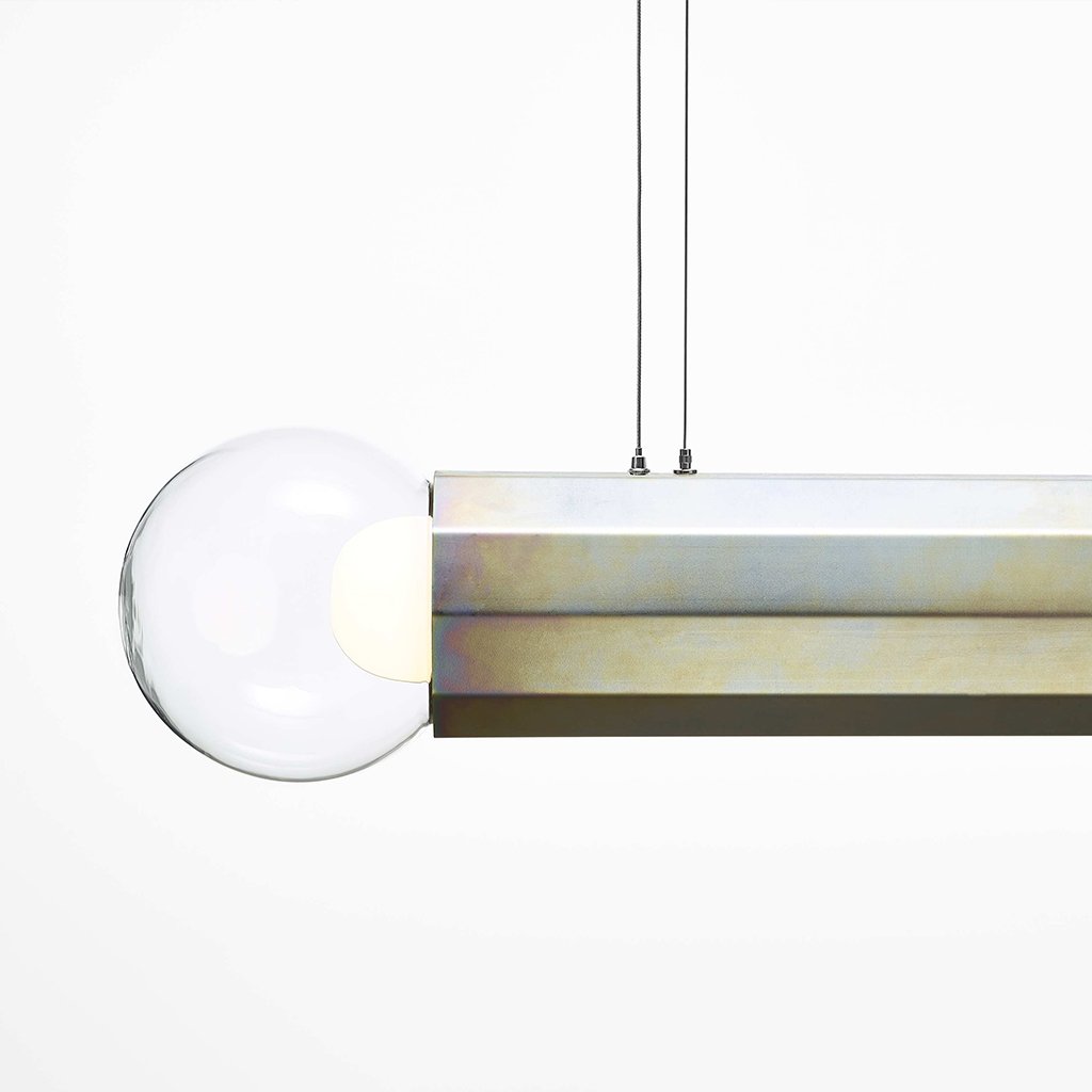 Svítidlo je vyrobené z kovu a ručně foukaného skla.