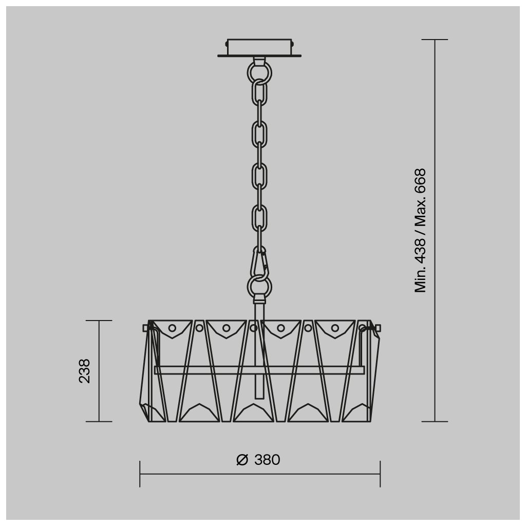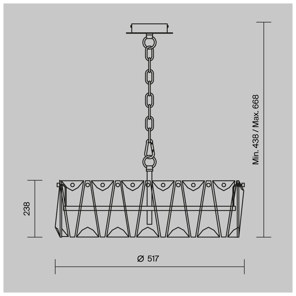 Součástí je stropní válcová rozeta v barvě svítidla a nastavitelný řetězový závěs s délkou až 430 mm.