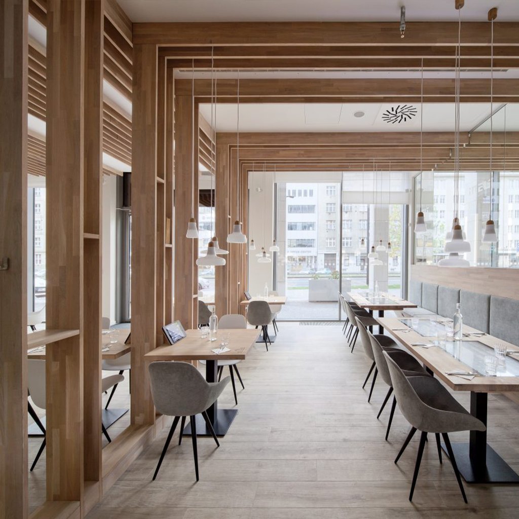 Svítidlo je vyrobené z ručně foukaného skla a dřeva.