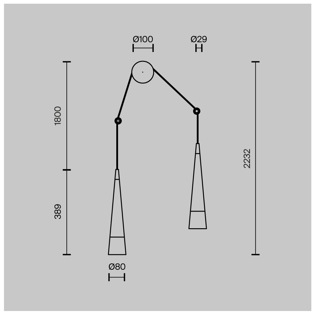 Součástí je válcová nástěnná rozeta v barvě svítidla s rozměry ø100 mm, dva nástěnné úchyty s rozměry ø29 mm a nastavitelný závěs svítidla s délkou pro každou hlavu až 1800 mm.